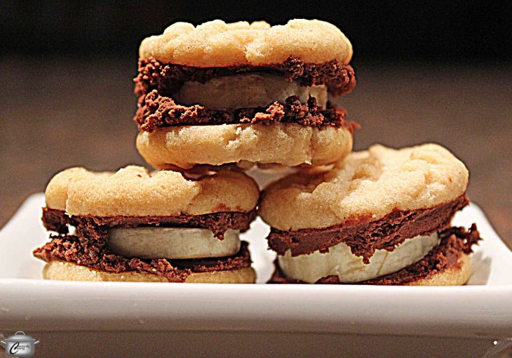 - Spread the bottoms of two cookies with a layer of ganache, using the tip of a table knife. Lay a thin (1/4 inch or less) slice of banana on top of the chocolate on one of the cookies, then sandwich the two cookies, frosted sides together, pressing gently so the chocolate and banana stick together.