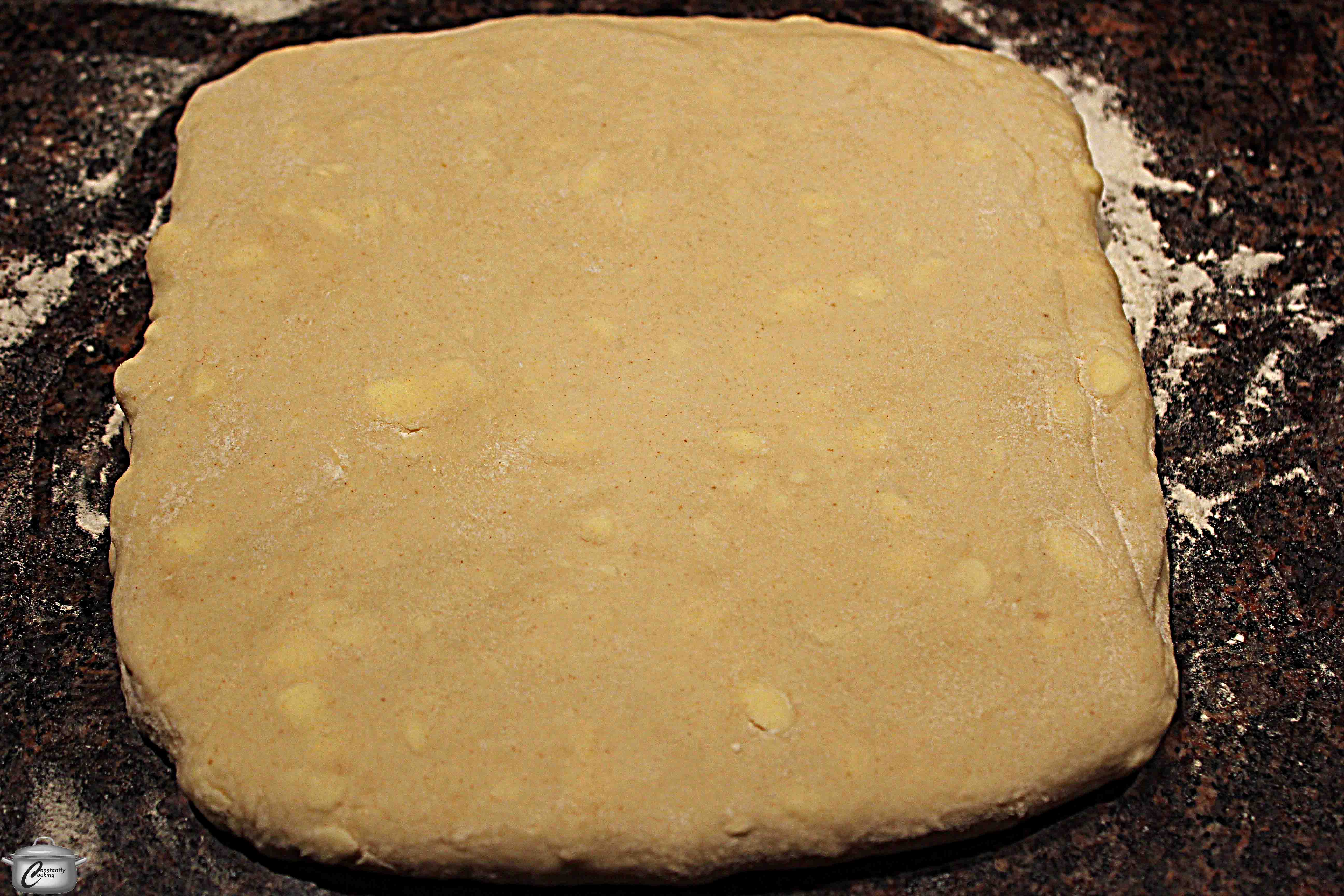 • Unwrap the dough and dust it with flour. Gently pat the dough out to about three times its size on a floured counter, trying to maintain the rectangular shape.
