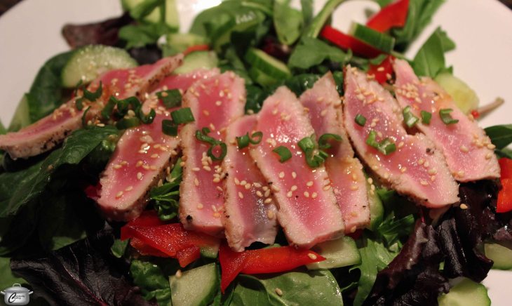 - Remove tuna from pan and slice into 1/4″ thick slices; fan these out over the plated greens and vegetables.
