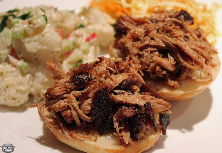 My relatives in North Carolina first introduced me to the awesomeness of true Southern barbeque (a food style, not a device) years ago and I was instantly smitten. I’ve since discovered through a lot of experimentation that you don’t need a lot of fancy equipment to make really, really good pulled pork. Starting the meat in the oven and finishing it on a gas grill with a few packets of wood chips to impart a smokey flavour makes for an easy yet spectacularly delicious version. This process takes approximately 6 hours but for much of that time all you’ll need to do is savour the aroma of delicious roasting meat! In the Carolinas, most pulled pork comes on a bun (I like to use my challah dough to make them) along with coleslaw and potato salad.