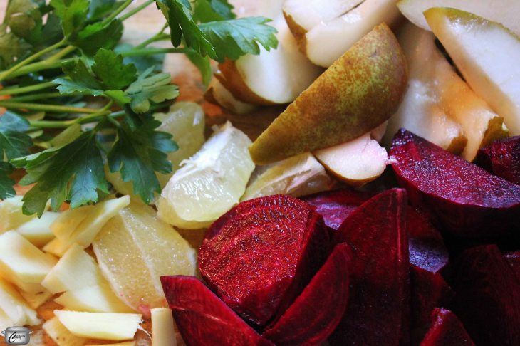 Probably my favourite vegetable juice is a ruby-red beet blend (recipe below). I developed this recipe for several reasons, not the least of which is the fact that beets are packed with antioxidants and nutrients, including magnesium, sodium and vitamin C. They’re also sweet and delicious as well as being quite inexpensive. In general, the vegetable juice combos I make are significantly less expensive than the fruit blends, so I am incented to make them more often.