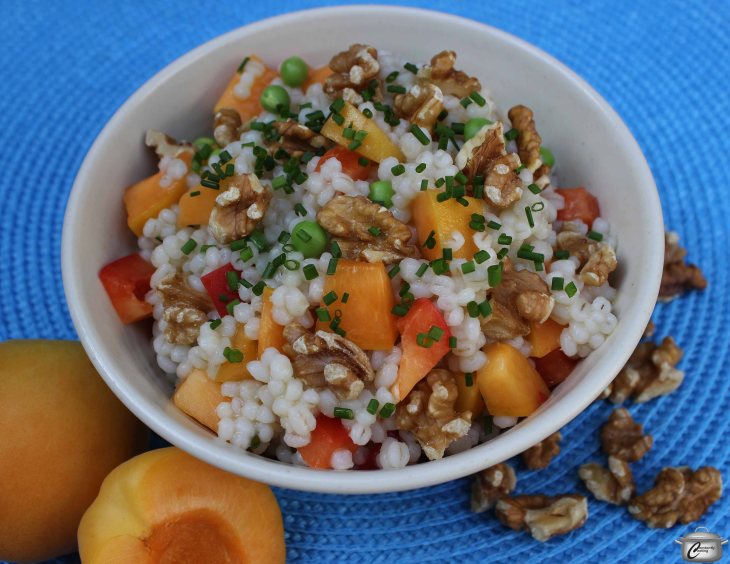 - Chop red pepper, apricots and chives; set aside. Put peas in a serving bowl. When barley is tender, drain well in a colander then pour hot, drained barley over peas in the bowl to cook them slightly.