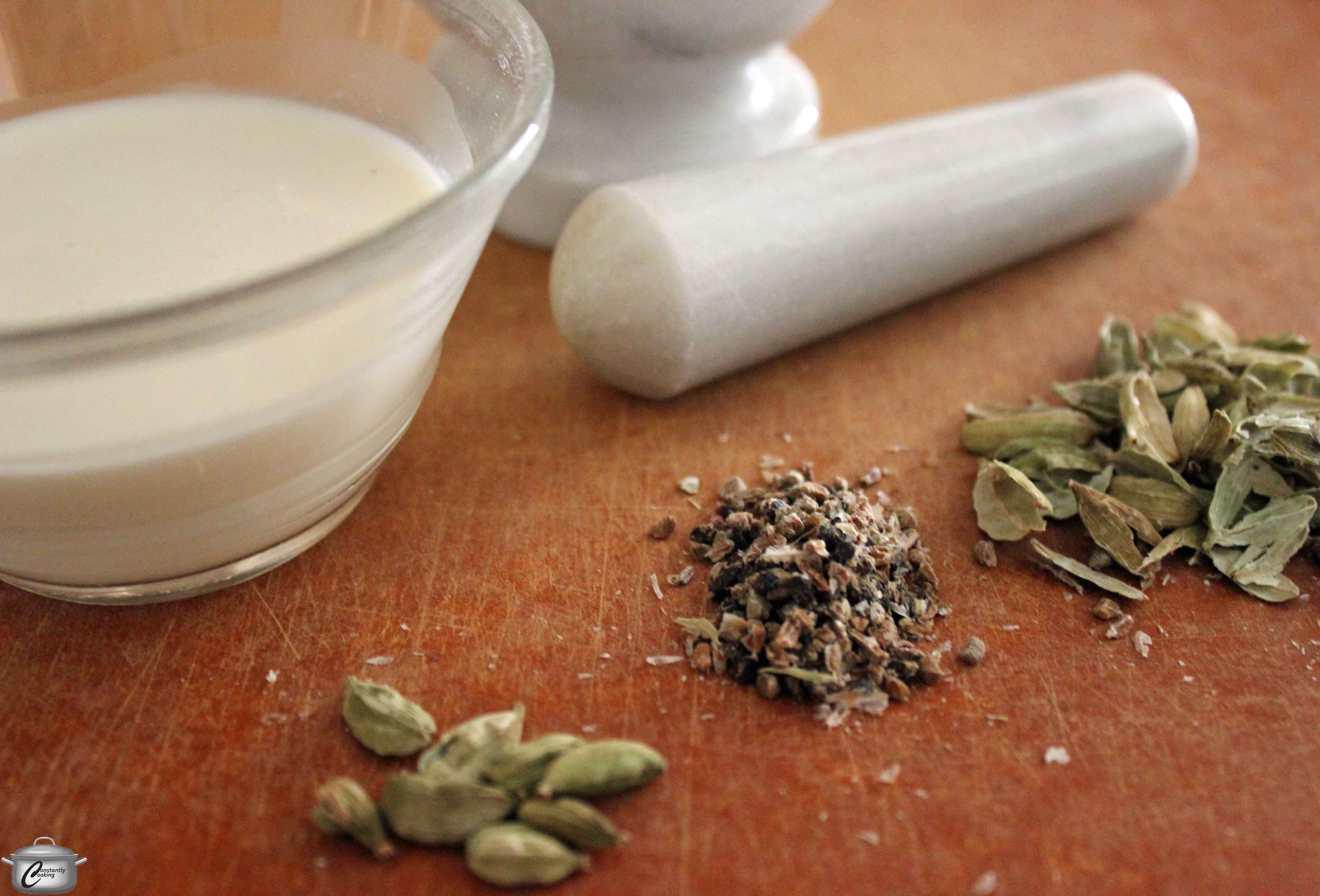 - One to twelve hours before you want to make your scones, crack open the cardamom pods to extract the brown seeds. This can be done easily with a mortar and pestle. You should end up with about a teaspoon of seeds.