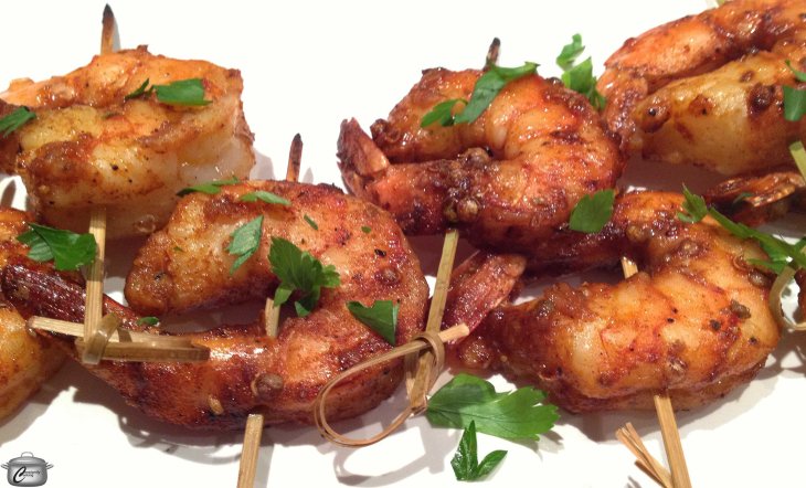 These tasty little morsels were a smash hit when I served them recently. They can be prepared a few hours ahead and left to marinate in the fridge, then put on the grill for just a few moments of cooking time. I skewered them on pretty little picks before planking them so they would be easier to cook, serve and eat. Grilling the halved lime before squeezing it over the cooked shrimp gives the juice a subtly smoky flavour that enhances the dish. As with all seafood, it’s good to source sustainably harvested shrimp if you can. Also, size matters; I used the extra jumbo (16/20 count) to make the dish as impressive as possible; you can use an equivalent amount by weight of jumbo or even large shrimp instead, though you’ll have more turning to do at the grill. You could easily double or triple this recipe; just be sure you have enough planks on hand, or cook the shrimp quickly in batches before the board catches fire. Icy cold beer is the perfect accompaniment.