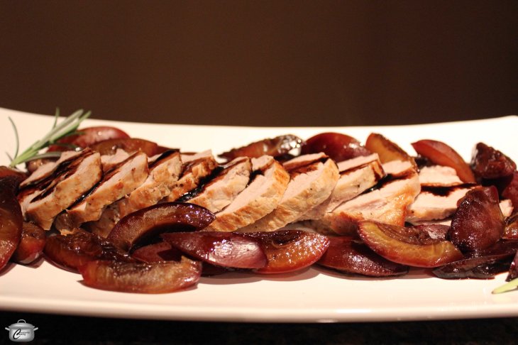• Cut the pork into thin slices and arrange on a serving platter along with the roasted plums. Drizzle half the sauce over the pork and pass remaining sauce at the table.