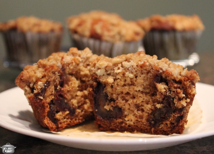 For centuries, dates have been a prized fruit in many different cultures and cuisines, thanks to their amazing flavour and nutrition. Providing a great energy source and packed with fibre, antioxidants, potassium and loads of other essential nutrients including calcium and iron, we should all be eating these little beauties more often. Yes, despite dates being nutritional powerhouses, it seems that, in North America at least, many people sometimes find it hard to look beyond date squares for ways to incorporate this fantastic fruit. I admit that I am a big fan of date squares myself, but wanted to come up with a less-sweet treat. Behold: the date square muffin was born – a healthy muffin studded with chopped dates and finished with the familiar date square crumble topping. Plumping the dates in hot water before folding into the batter ensures they stay tender when baked. To speed up the process for fresh, hot muffins at breakfast time, try measuring out the dry ingredients and making the crumble topping the night before as well as soaking the dates overnight in cool water in the refrigerator. Date square muffins are best on the first or second day after baking but freeze extremely well for later consumption.
