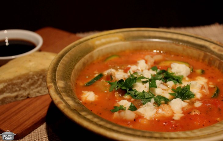 - 15 minutes before ready to serve, bring the vegetable mixture back to a simmer. Add haddock, shrimp and zucchini; stir very gently to combine. Add a bit more broth if you would like the stew a little less thick. Cover pot and simmer for 15 minutes or until fish flakes easily with a fork.