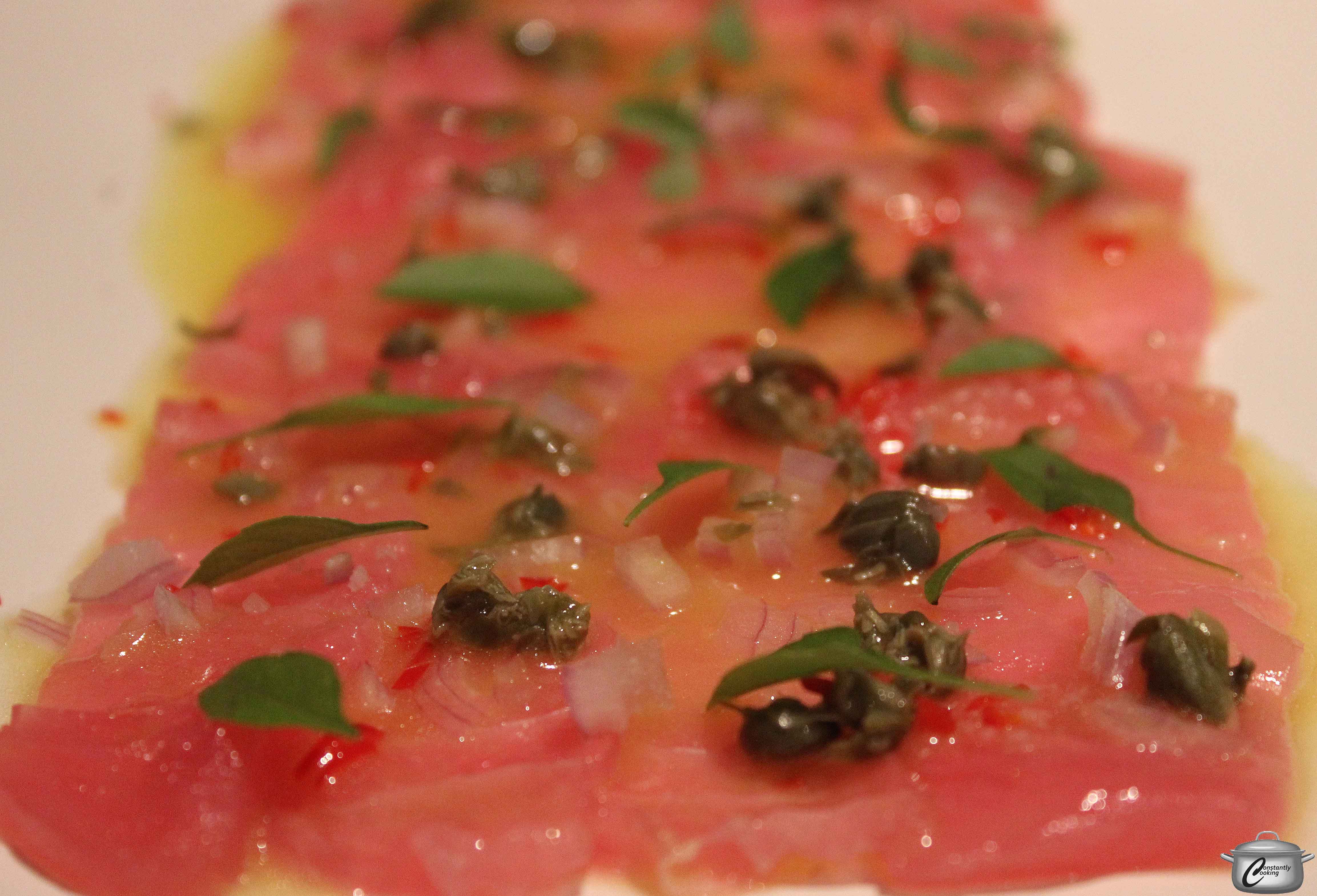 I’ve long been a fan of well-prepared raw fish, having first tasted excellent sushi on a trip to New York City in the early 1980s. Not long after, I was delighted to discover ceviche – an intoxicating blend of fish, citrus juice and chilies that hails from Peru. Next up was my first just-plucked-from-the-sea raw scallop. New to me this year was another variation on raw fish, known simply as crudo (Italian for ‘raw’) which I discovered at Supply and Demand, a delicious eatery in Ottawa which was just named number 4 on the respected enRoute magazine’s list of the top new restaurants in Canada. My husband loves Supply and Demand’s tuna crudo so much that I was determined to come up with my own version. As with all raw fish dishes, be sure to use the best quality tuna you can find, and purchase it from a reputable fishmonger.