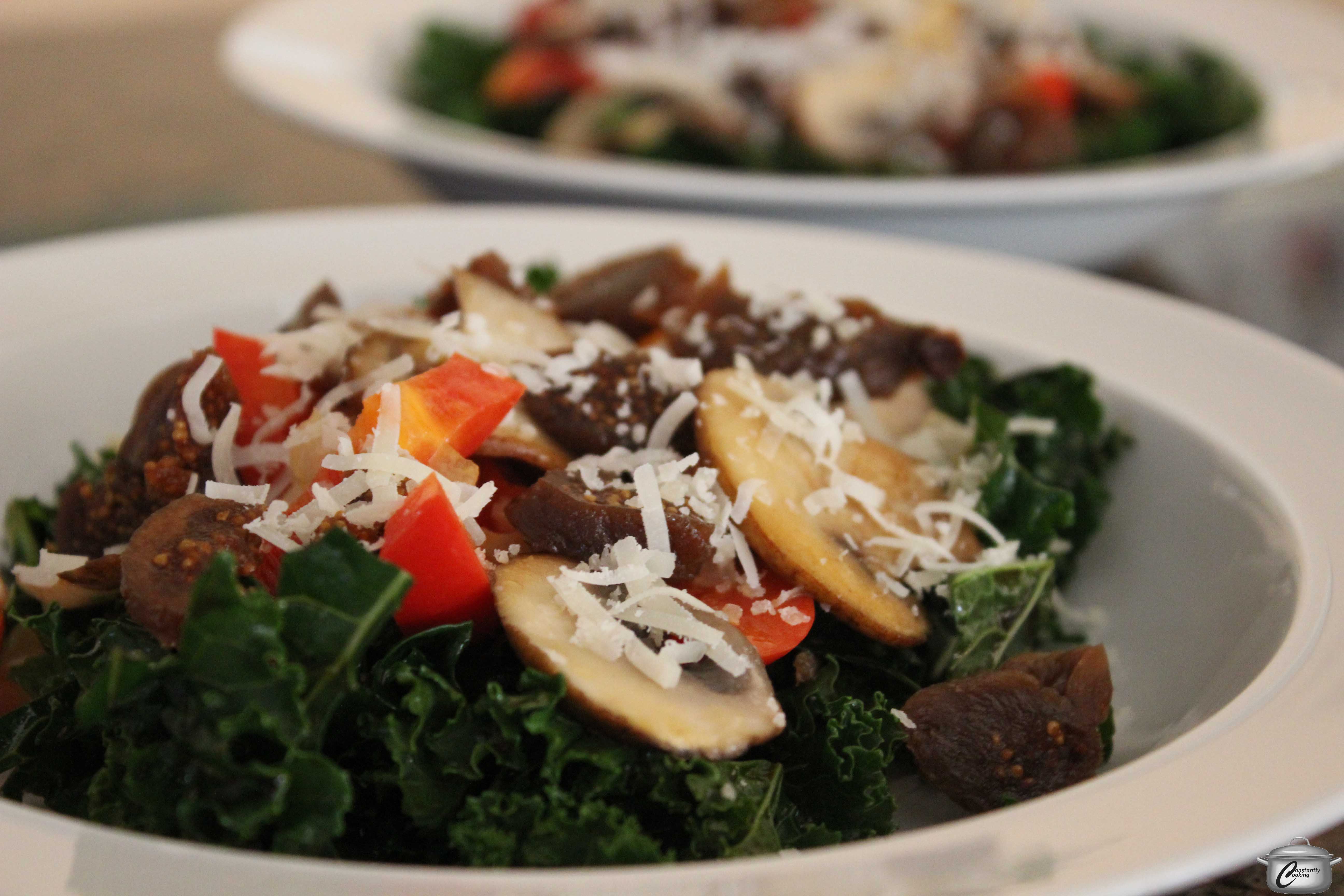 • Divide the cooked kale among four plates or shallow bowls. Top with onion, peppers and mushrooms. Scatter fig slices over top and garnish with Parmesan (omit the cheese if making for vegans).