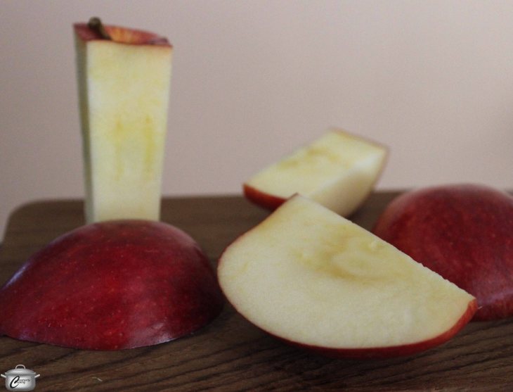 - Wash apples but do not peel. Core and slice thinly. The easiest way to do this is to cut the apple off the core in four pieces which can then be sliced easily.