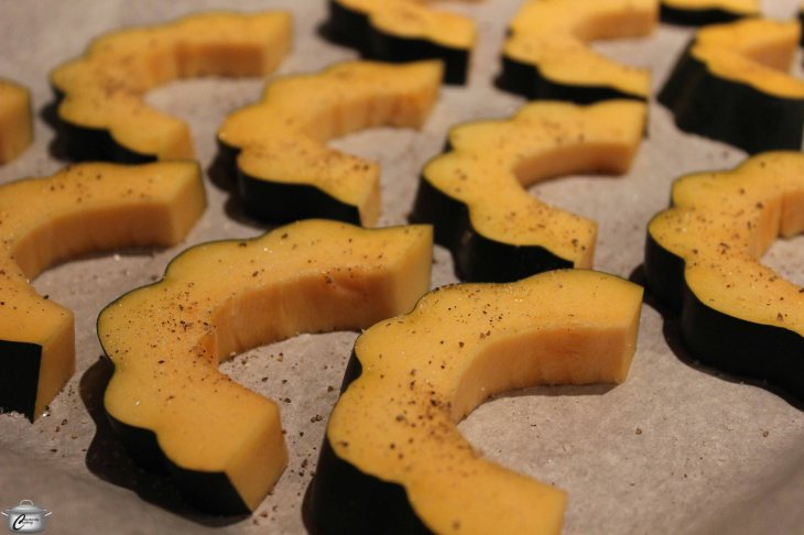 Squash is hands-down one of my favourite winter vegetables. I love it in soup, risottos and so much more and it makes frequent appearances as a side dish in all sorts of meals I serve. The only downside, to me, is that roasted and/or mashed squash doesn’t add a lot of beauty to the plate. It just kind of sits there, delicious as can be, but trying ever so hard not to look like baby food. As for acorn squash, I particularly love its flavour but those hard green orbs are tricky to peel and simply quartering and roasting them makes for a rather unwieldy piece of squash on the plate. I decided to try slicing the raw squash and roasting it – eureka! It is such a fast way to prepare it and it looks very pretty on any plate.