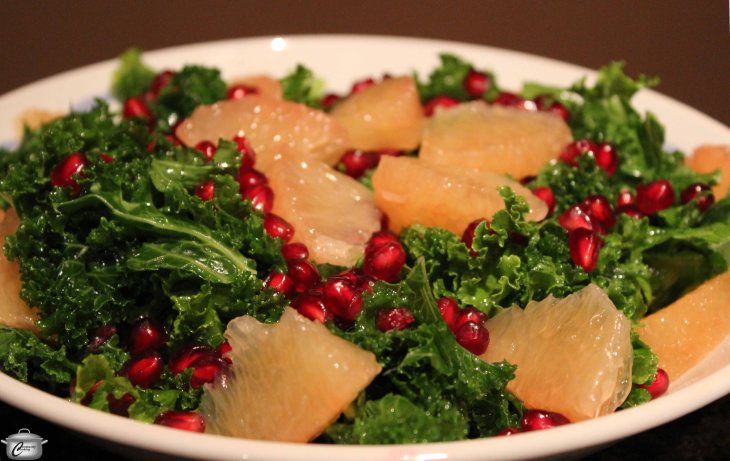 Who says wintertime has to be a fresh food wasteland? While it is a lot harder to eat local during the cold months, there are numerous items which are in season at this time of year. Pomegranates and grapefruit are among my favourite midwinter delights and both make excellent additions to a crunchy, flavourful kale salad that is as nutritious as it is colourful. As previously noted in another favourite kale salad recipe of mine, unlike salads made of tender greens, dressed kale salads store beautifully for a day or so after they’ve been made. This salad is a great gateway to incorporating more vegetarian, vegan and raw foods into your diet but even carnivores will love it too!