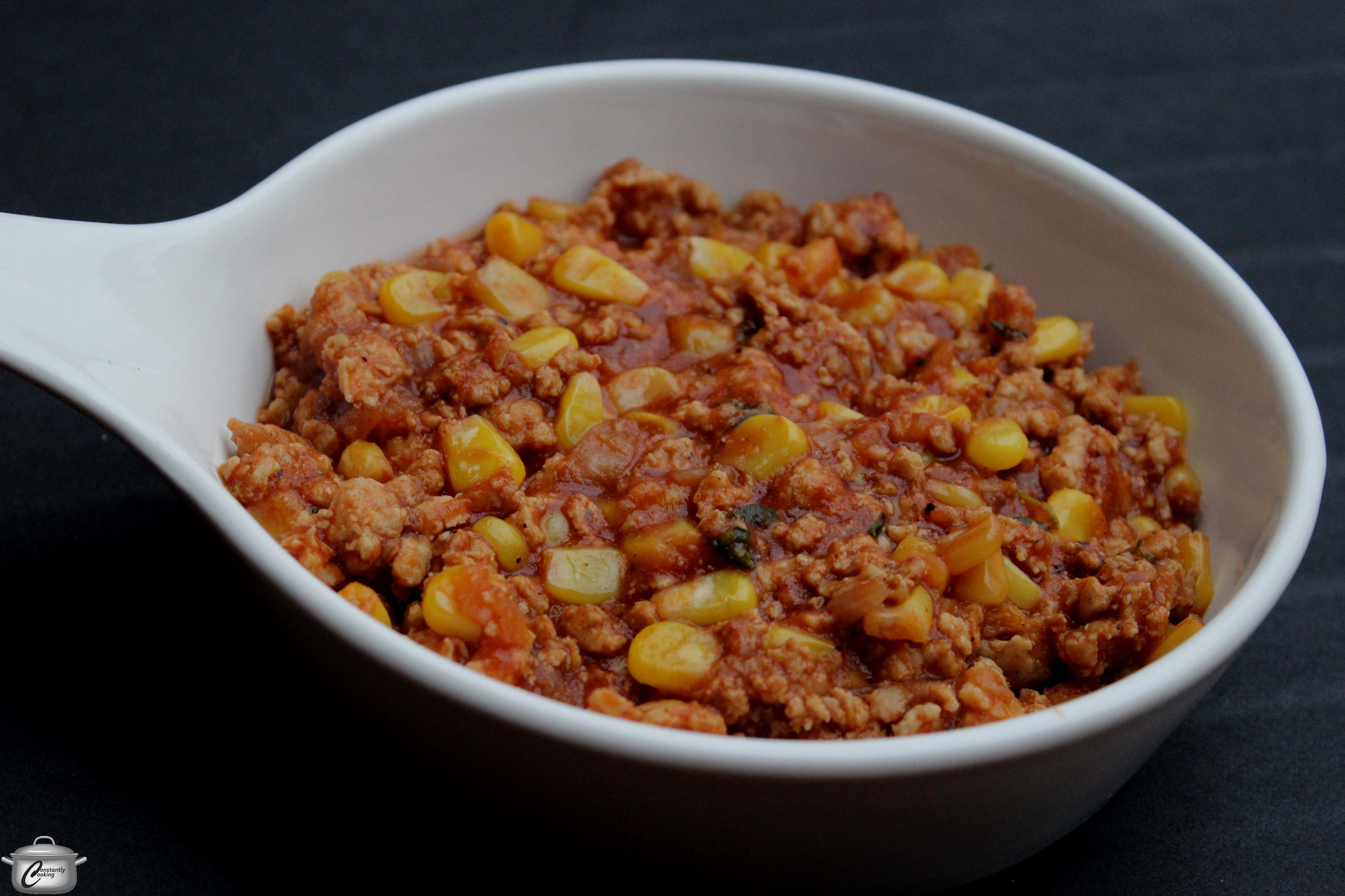 - When the meat is almost completely browned, add salt, pepper, thyme leaves, tomato paste, Worcestershire sauce, water and corn. Stir, then cover pot with a lid and cook over low heat, stirring once or twice, for 15 – 20 minutes so flavours can blend.
