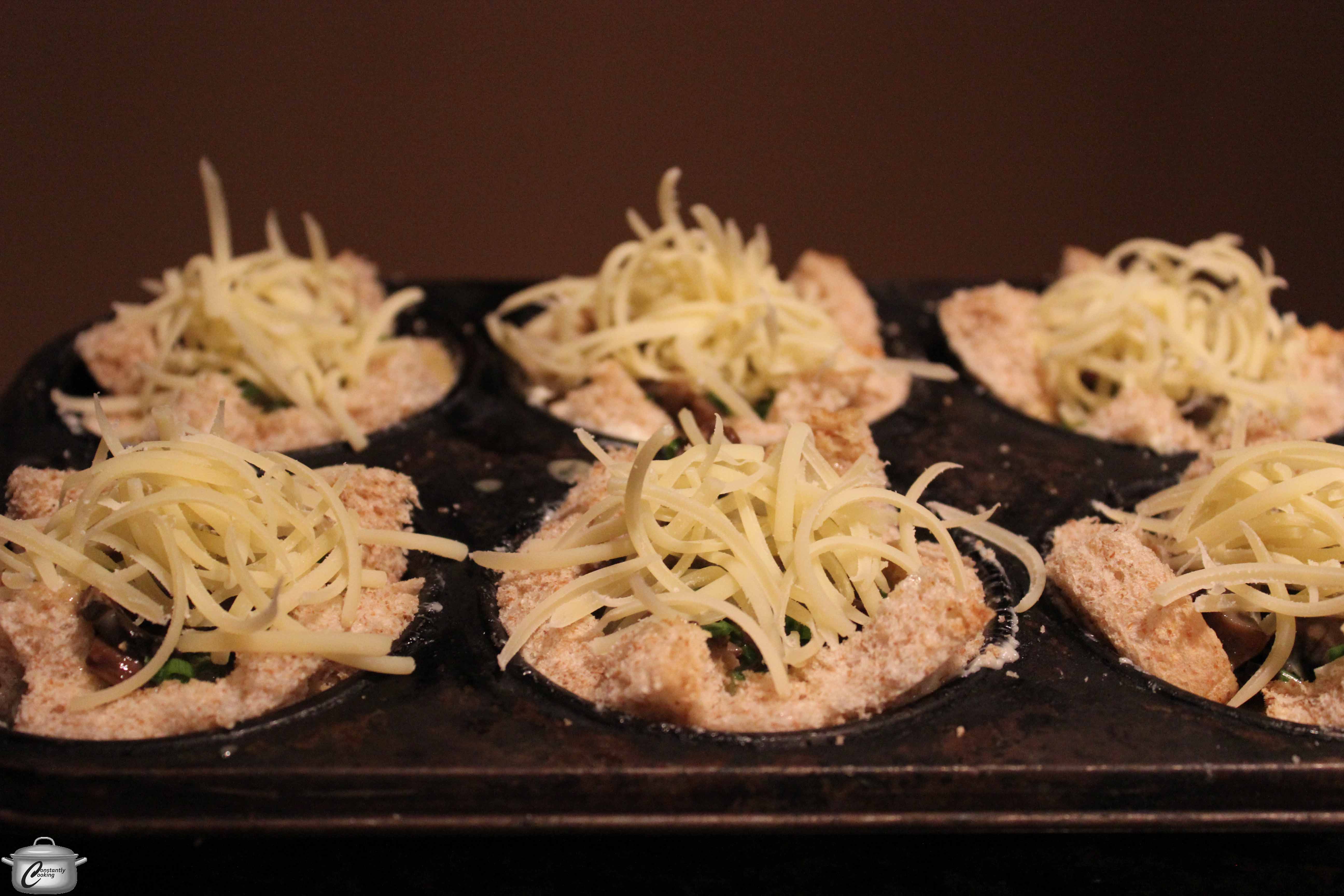 - Butter one side of each bread slice. Press the bread, buttered sides down, into a muffin tin.