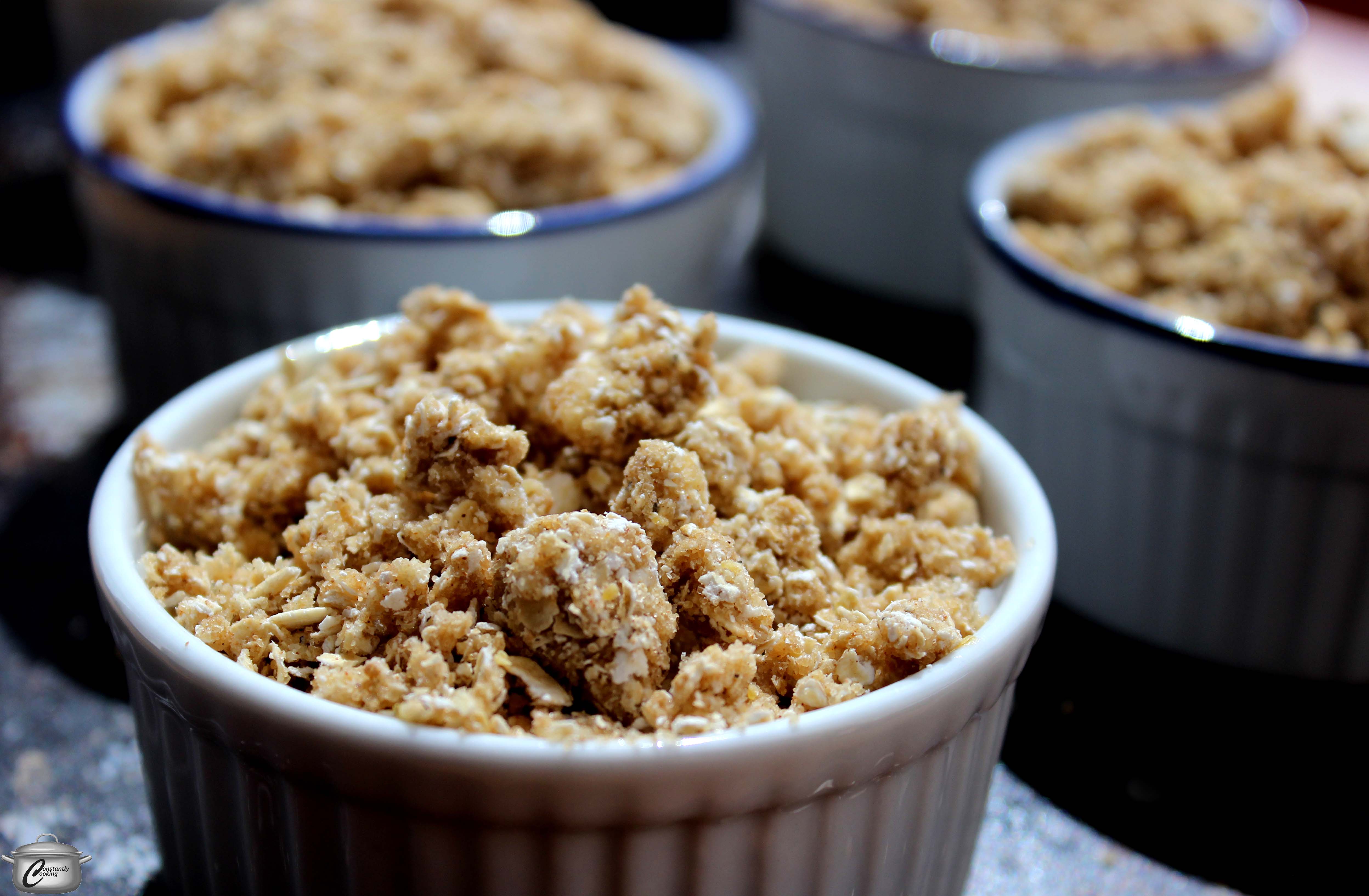 - Prepare the crumble topping up to 2 days ahead of time by combining the oats, oat flour, brown sugar, cinnamon and cardamom in a medium bowl.