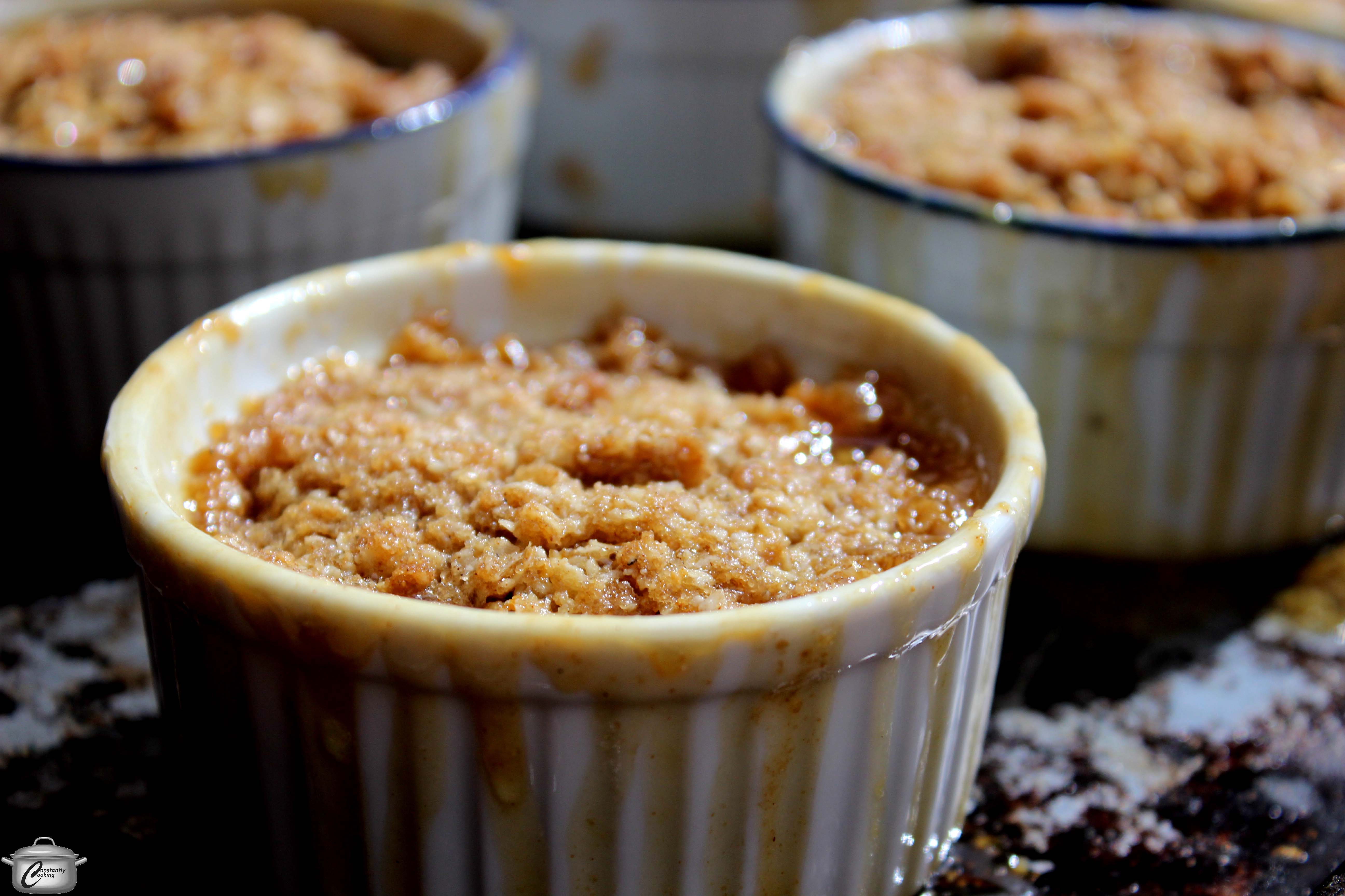 - Divide the fruit and caramel sauce among six 1/2 cup (125 mL) ramekins (or put the fruit and caramel sauce into a medium-sized oven-safe glass or ceramic baking dish) which you have set on a baking sheet (to catch drips as the caramel bubbles up in the oven).