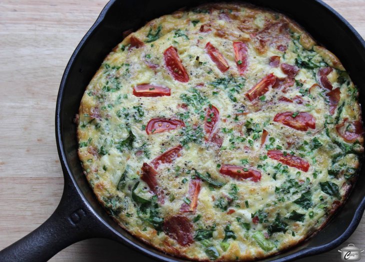 Now that spring is here, I have this urge to clean, making the house beautiful inside so I can throw the windows open and let in the sun-warmed breezes. My fridge seemed like a good place to start. I’ve been busy experimenting a lot in the kitchen these days, so I had a lot of odds and ends left over. This frittata is a great brunch dish that can be filled with whatever you want to use up. Immediately after I posted this recipe, my friend Meg told me that her British friend calls this a “tip-fridge dinner” (as in, you’ve tipped out the fridge to use up what’s there). Tip Fridge Frittata has a nice ring to it! Thanks, Meg! I recommend serving with a little salsa and maybe a nice side salad.