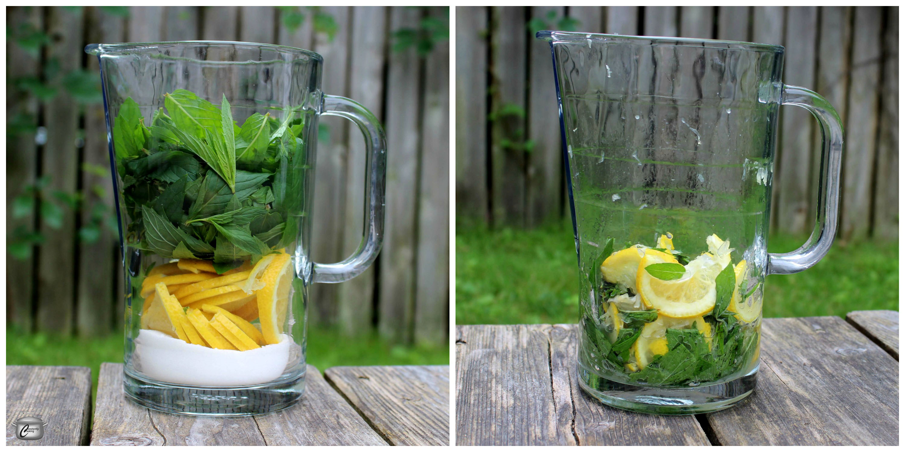 - With a wooden spoon, stir the mixture (muddle) vigorously to extract juices and aromatic oils from the lemon and mint.