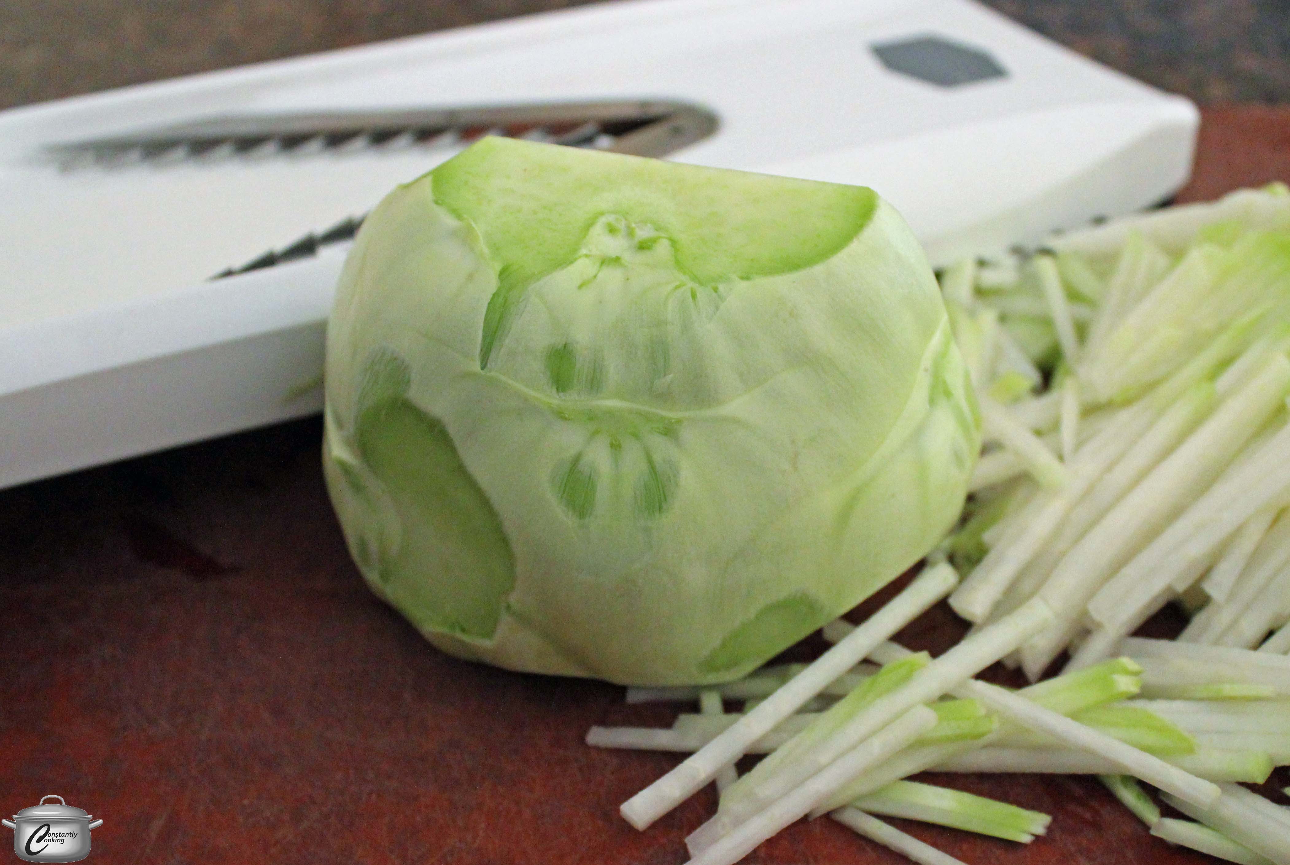 - Using a mandoline or a very sharp knife, slice kohlrabi into thin matchsticks.
