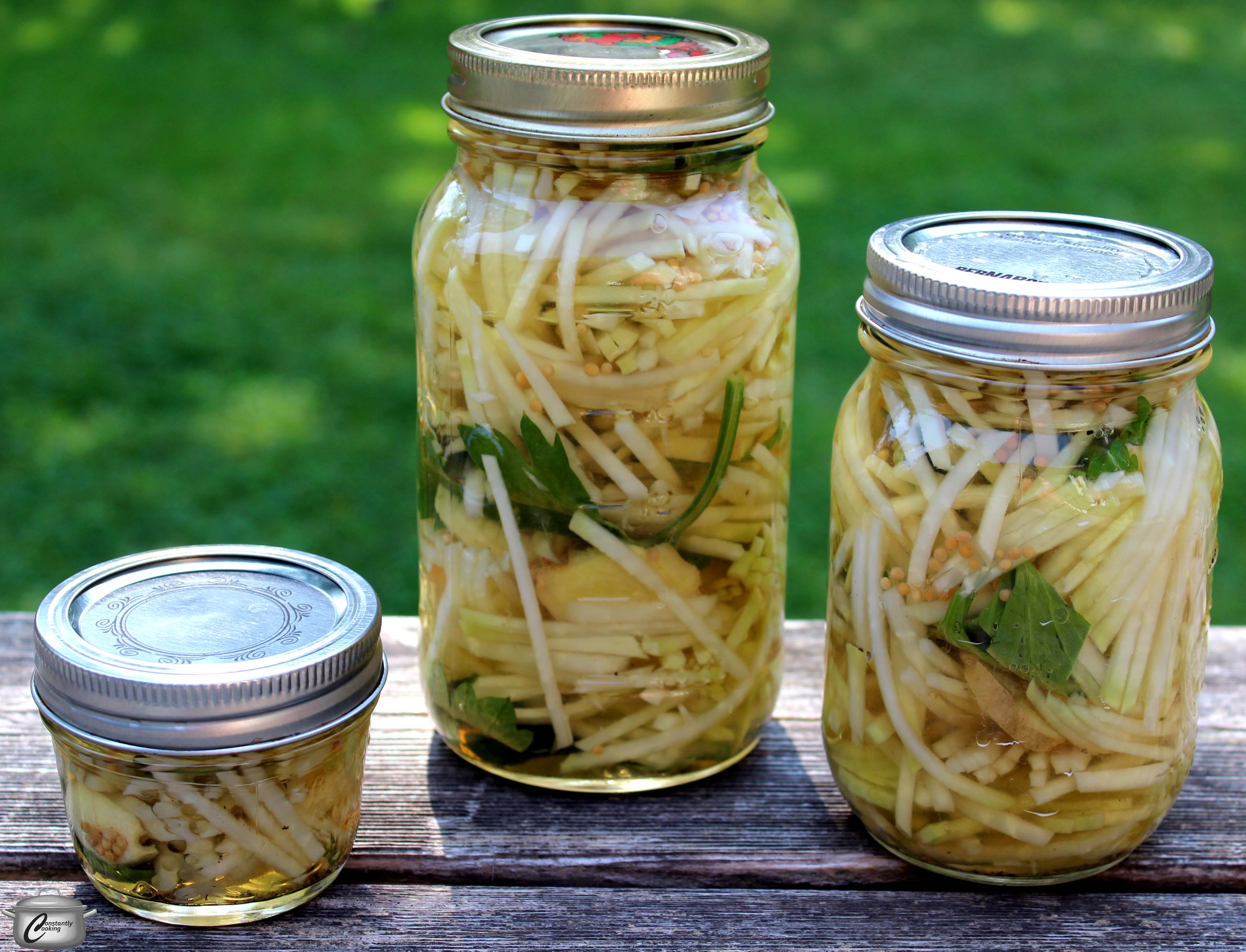 A member of the brassica family of vegetables which includes cabbage, cauliflower, kale and broccoli, kohlrabi is more sweet and tender than some of its cousins. I plan to use the pickled kohlrabi in sandwiches, salads and perhaps even just ‘as is’, like coleslaw.