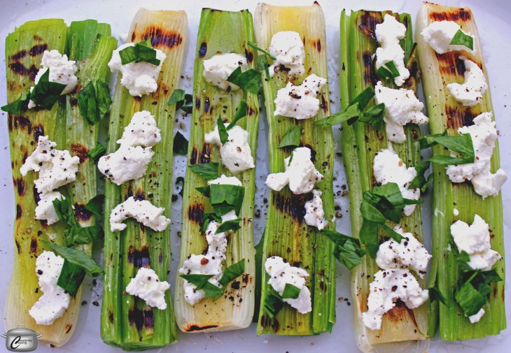 - Place grilled leeks on a serving plate and drizzle with rice vinegar. Top with pepper, crumbled chèvre and finely chopped celery leaves, mint or parsley.
