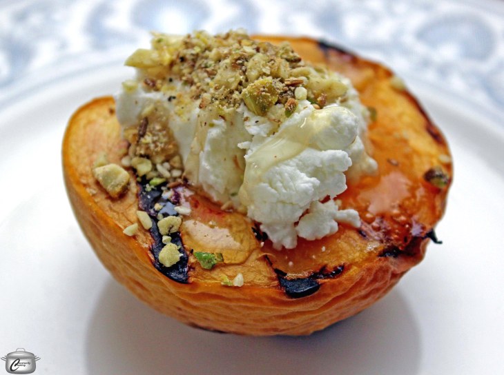 - Let cool for 5 minutes then garnish each peach with a generous dollop of chèvre and a sprinkling of dukkah. Drizzle with honey or white honey balsamic and add a little chopped mint.