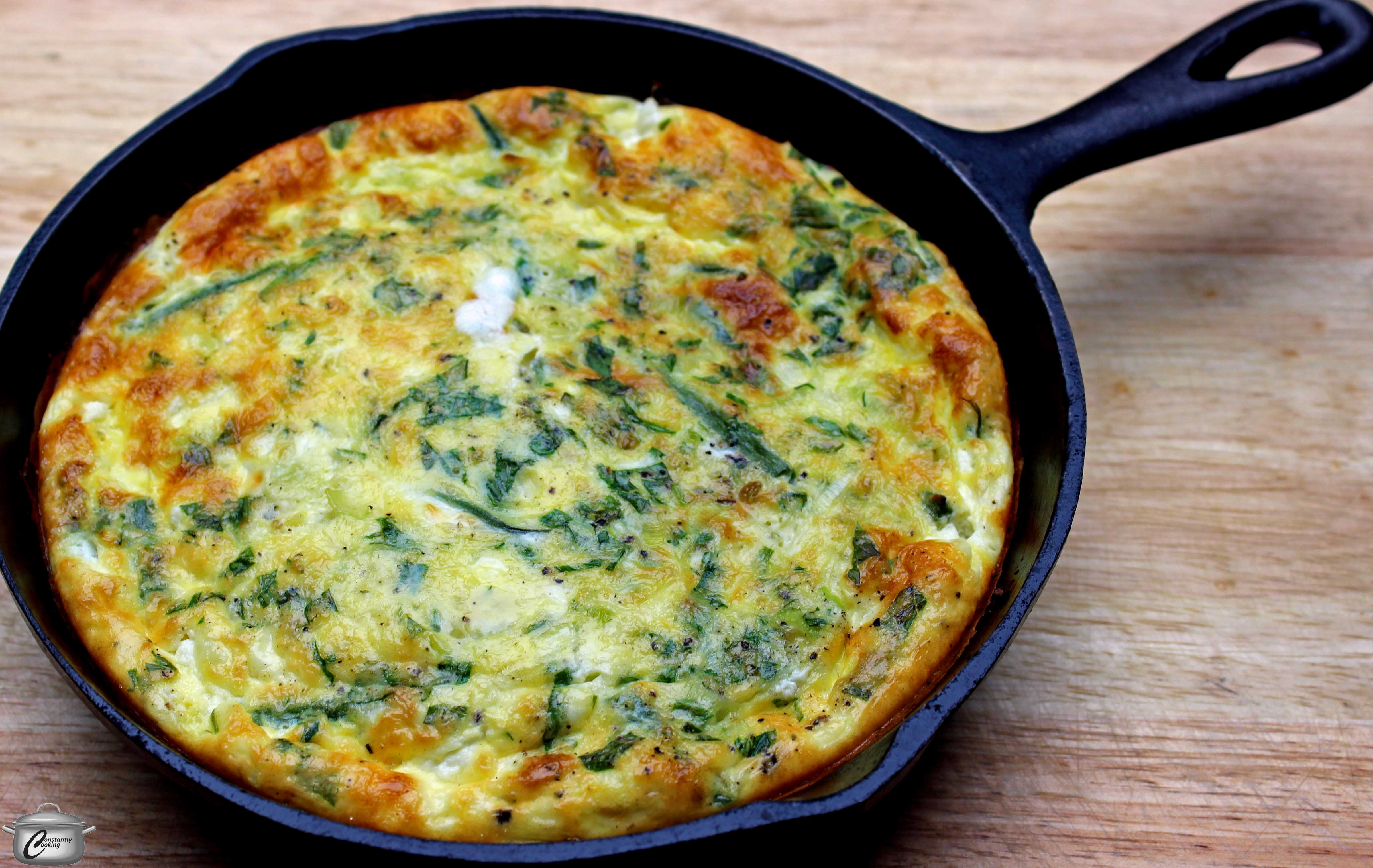 - Pour the egg mixture over the vegetables in the cast iron pan and stir briefly with a fork to combine. Sprinkle with chopped celery leaves.