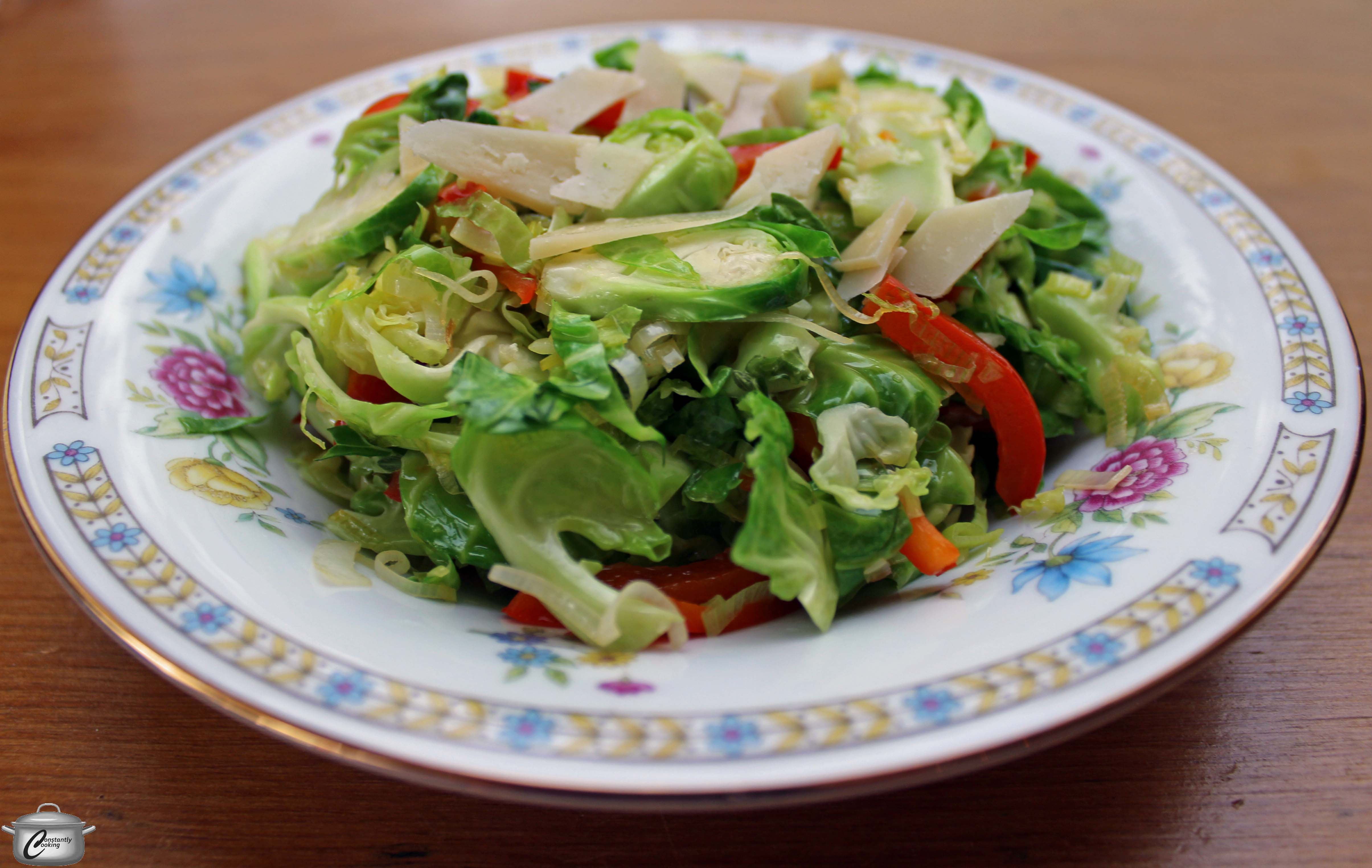 I have to confess that I have never been a big fan of Brussels sprouts so I was a little intimidated when I saw a box of them from the Avonmore Berry Farm stall at the Ottawa Farmers’ Market in my Farmers’ Feast Challenge basket. Despite a lifelong love of other cruciferous vegetables, especially broccoli, cabbage and bok choy, I have consistently avoided these little green orbs. I suspect it was the bitter, sulphurous odour they give off (not to mention the corresponding taste) when they are overcooked. At any rate, I will be ignoring these humble sprouts no more. Packed with nutrition, they are also exceptionally delicious when prepared with a little care. This pretty salad is a winner.