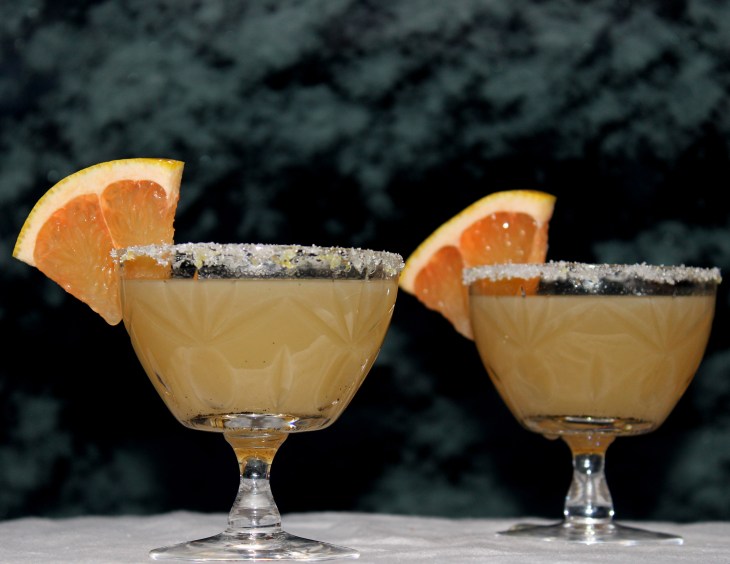 - Strain the cocktail into the two prepared glasses and garnish with fresh slices of grapefruit or twists of lemon.