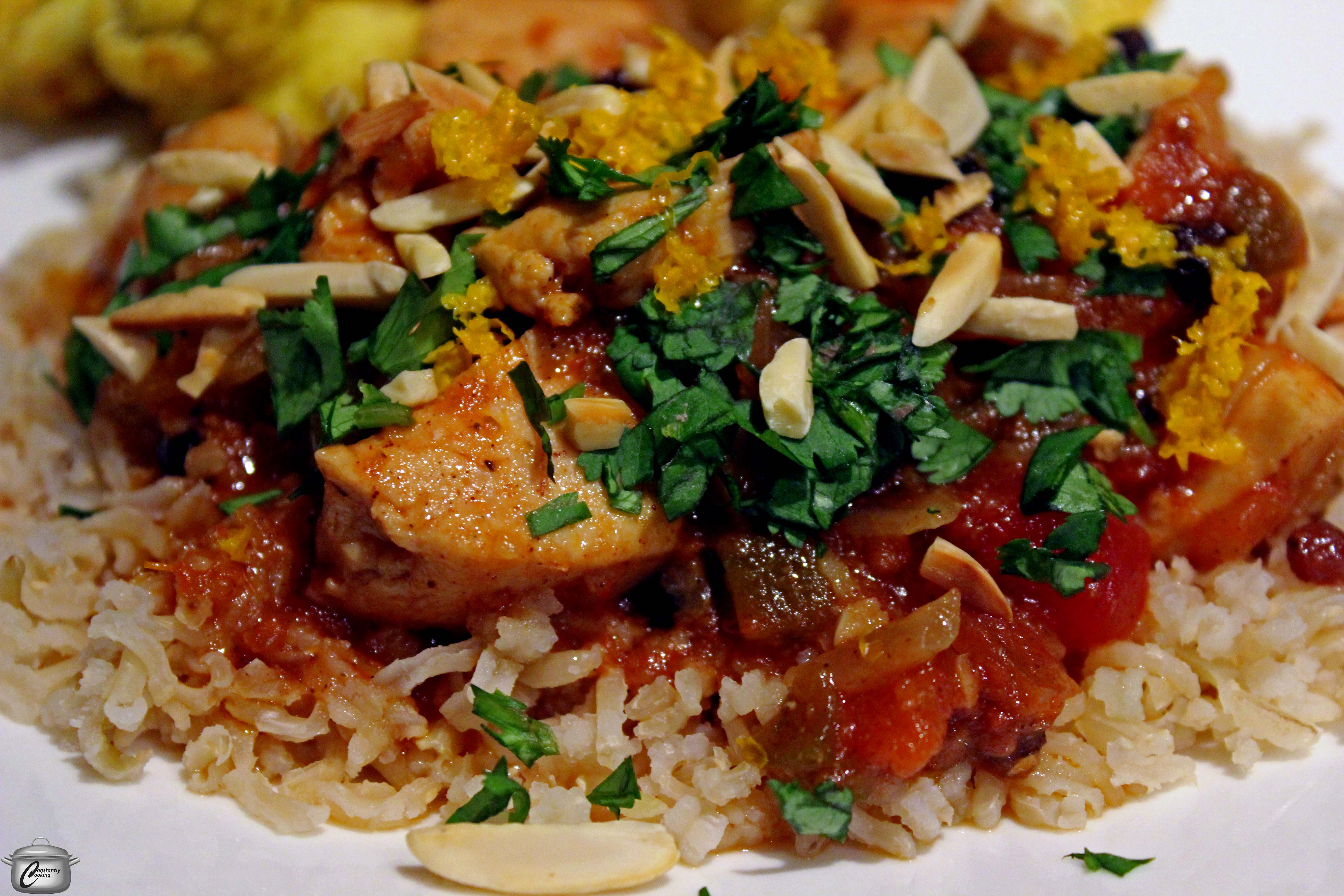 - Serve on a bed of couscous, rice or quinoa. Garnish with almonds and coriander, then quickly grate a little orange zest over each serving.