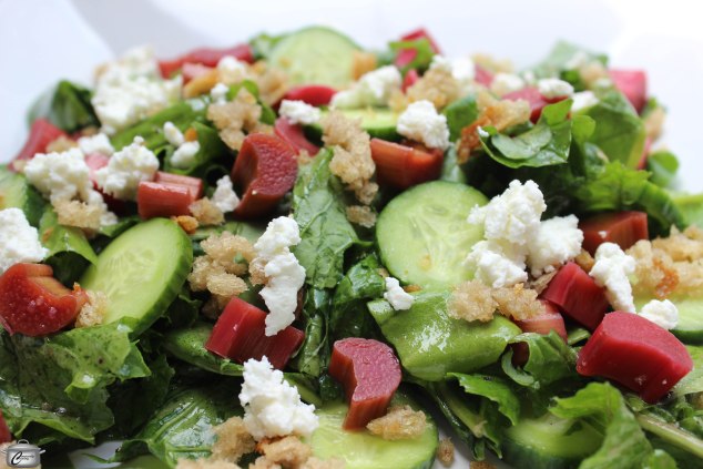 - Sprinkle pickled rhubarb and chèvre over greens.