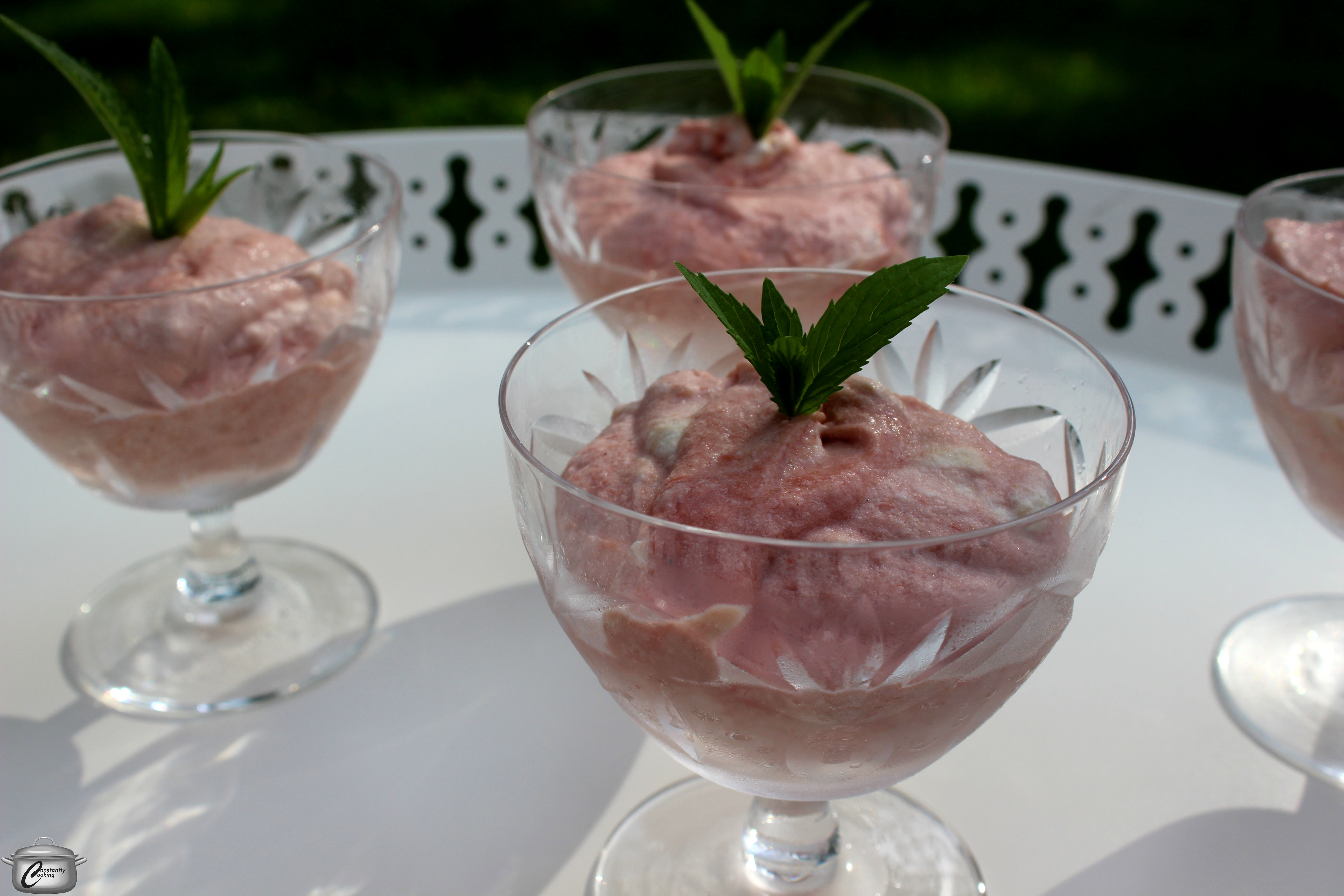 - Spoon into four serving dishes; freeze for up to 8 hours. Remove from freezer 20 minutes before serving; garnish with mint leaves at serving time.