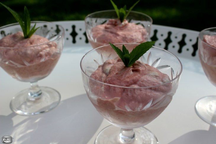 So often rhubarb is either used ‘as is’ in pies or fruit crumbles, or stewed up and served in rather uninspiring-looking ways. Taking the time to puree the cooked fruit not only makes it look a little more attractive, it gives it a uniform texture that is ideal for a mousse. You can serve this dish chilled or frozen, depending upon your preference (and how far ahead you get it made). I love the combination of rhubarb and cardamom but powdered ginger is a good substitute as well. Best of all – you can use just-from-the-garden rhubarb or some you have stashed in your freezer.