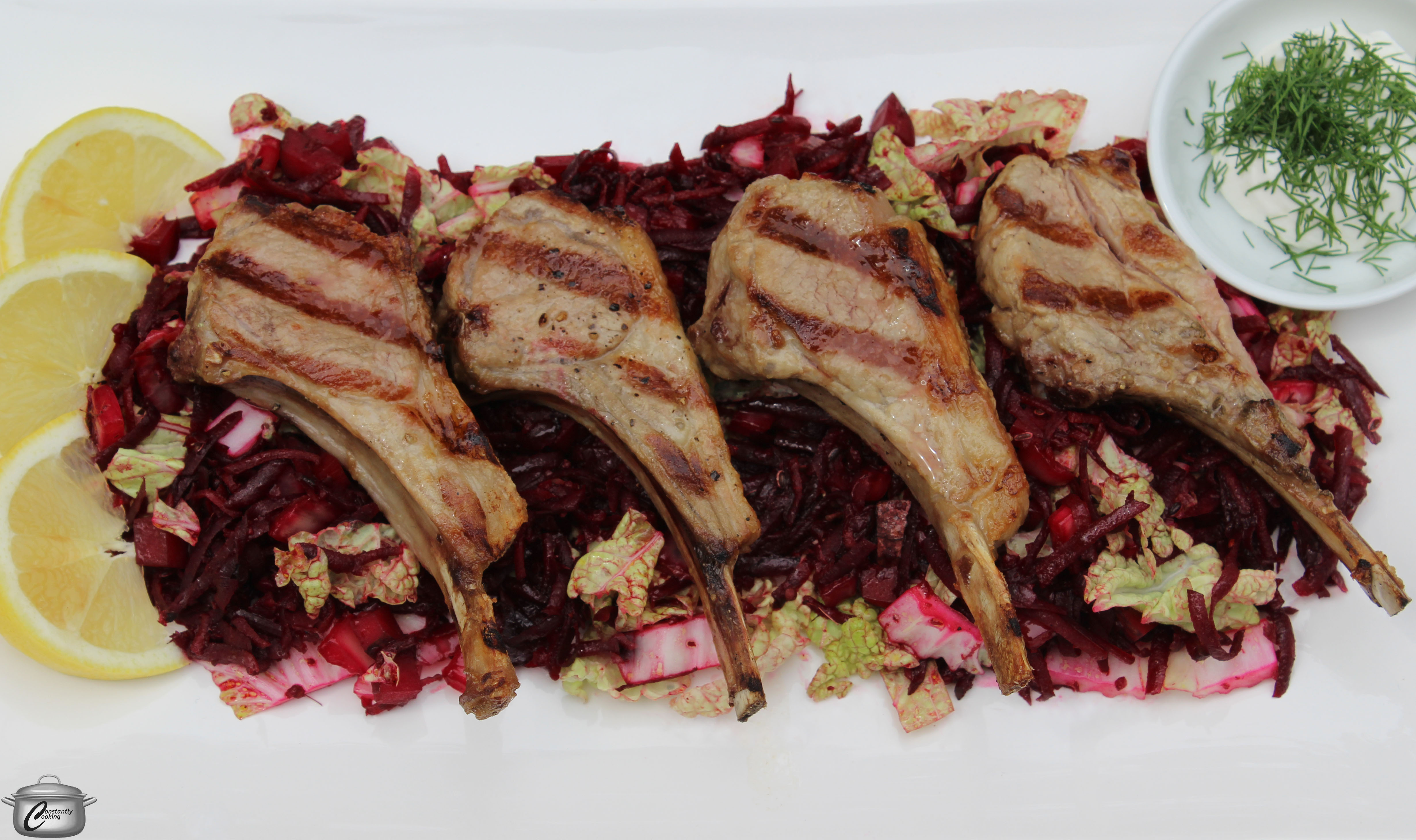 - Transfer the beet and cabbage mixture to a platter and top with lamb chops. Serve with lemon wedges and sour cream sprinkled with chopped fresh dill.