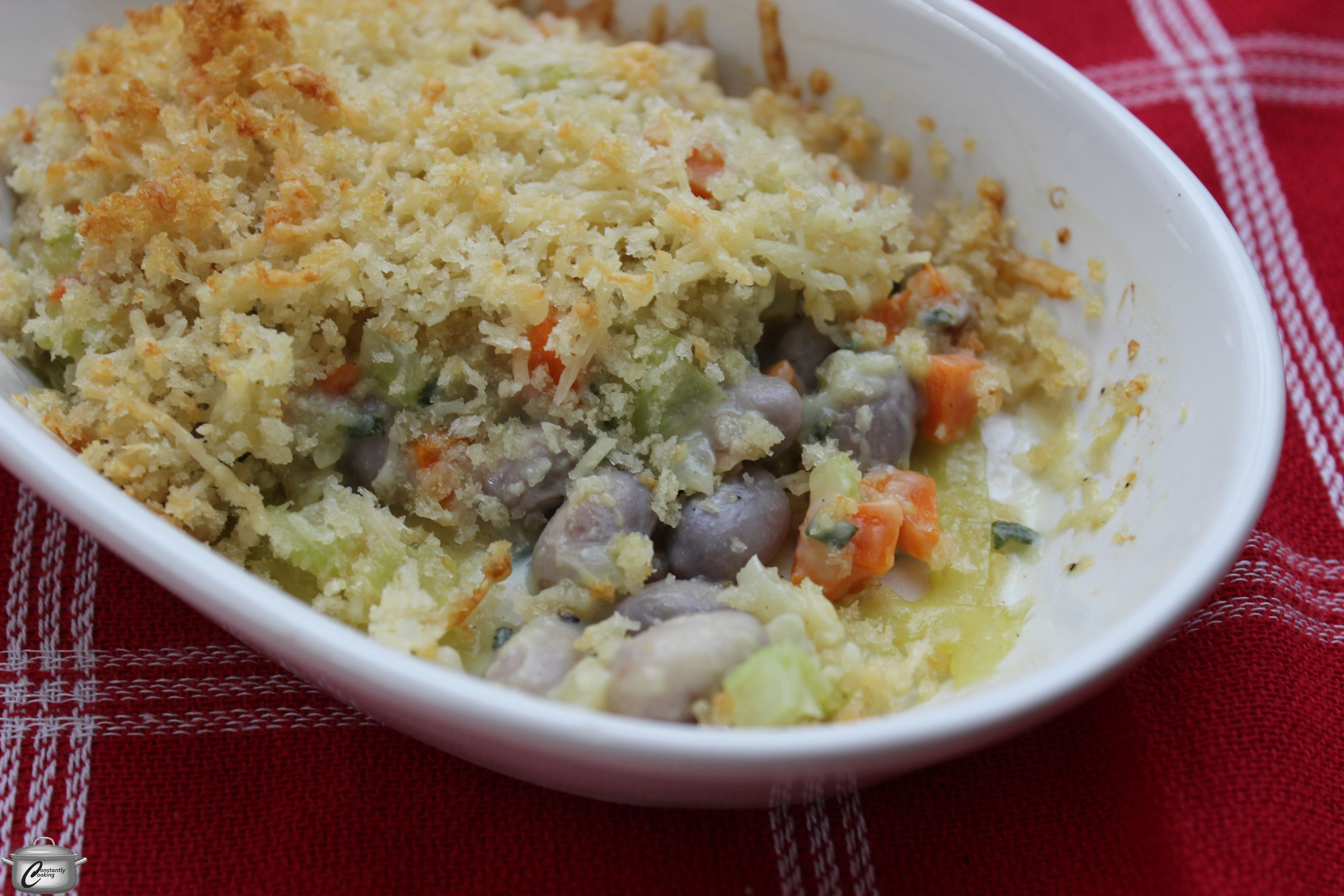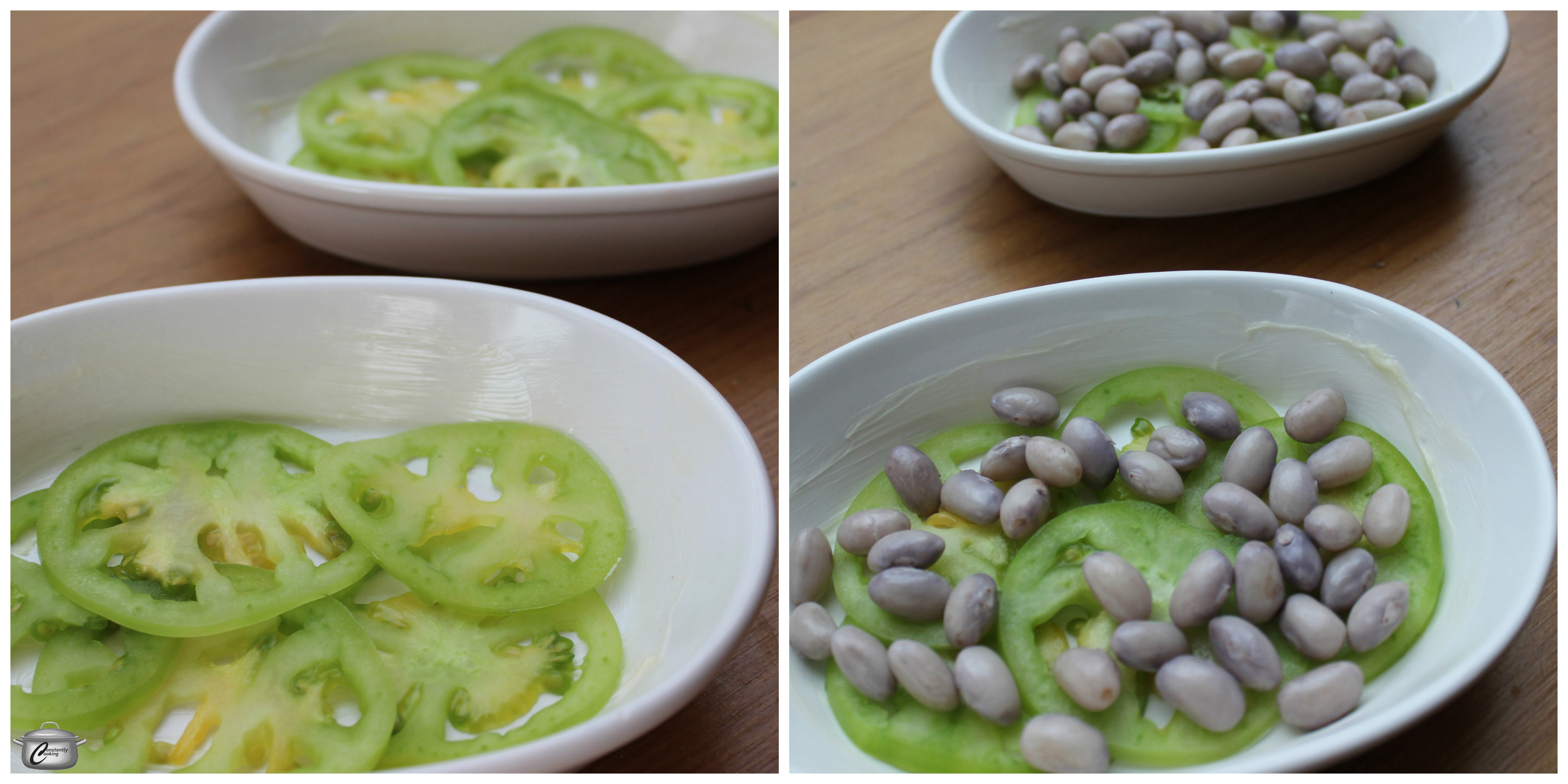 Ask anyone to name a dish involving unripened tomatoes and you’ll most likely hear, “fried green tomatoes”. While those are popular and delicious, I knew there had to be something else I could do with them when they showed up in this month’s Farmers’ Feast challenge basket from the Ottawa Farmers’ Market. I hit upon the idea of using them as a base for a vegetable casserole with a cheesy, crunchy topping. It’s also a great way to showcase freshly shelled beans, and any number of varieties would work, including Romano, Cranberry and more. Plus, the garlicky sauce will help to hide the beans if you’re dealing with picky eaters (you can even mash the cooked beans into the sauce if you want to get really sneaky)! I like to make gratins in individual serving dishes as they are so easy and pretty to serve. If you want to make a vegan version of this recipe, use olive or canola oil in place of the butter (or a non-dairy butter substitute) and use water, wine or non-dairy milk substitute for the sauce.