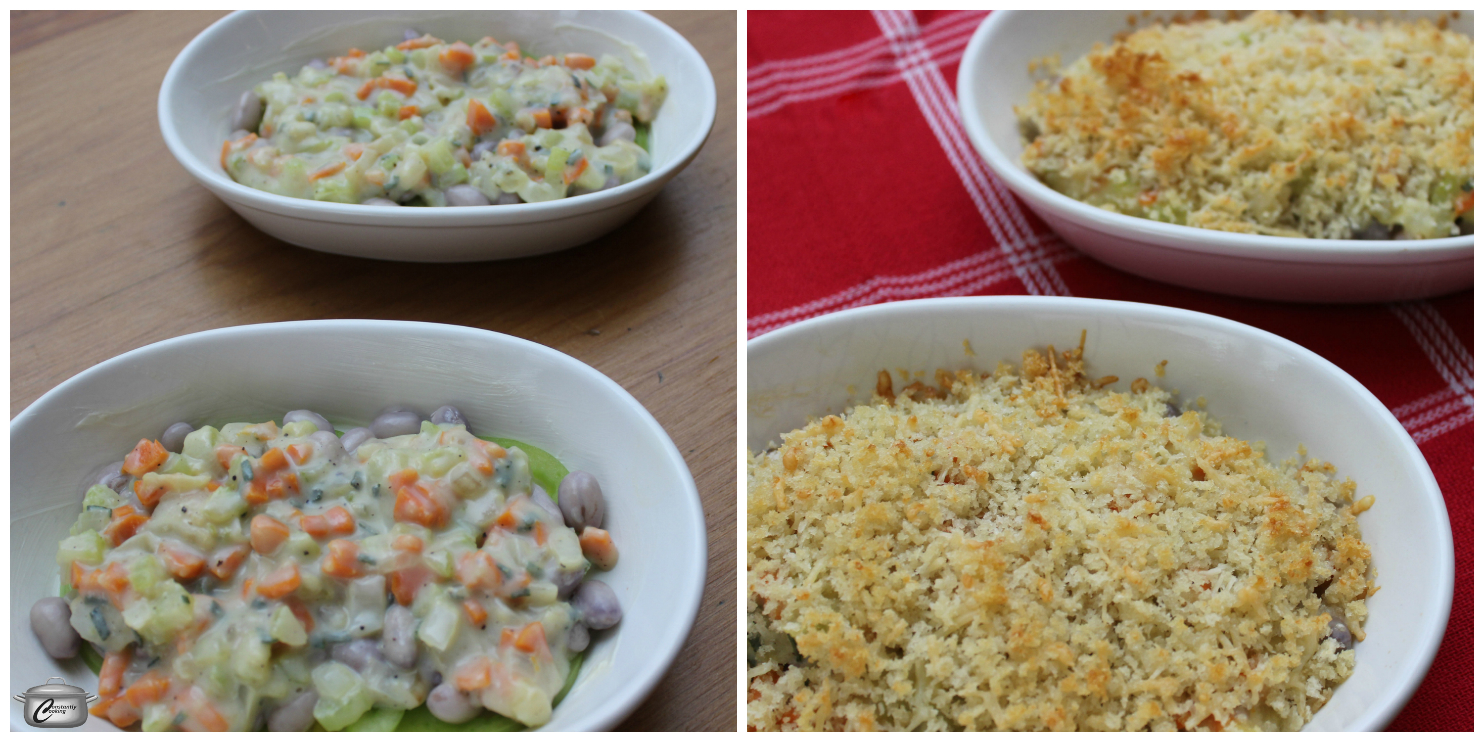 - Divide Panko topping evenly among the four dishes. At this point, the dishes can be covered with plastic wrap and refrigerated for up to 48 hours.