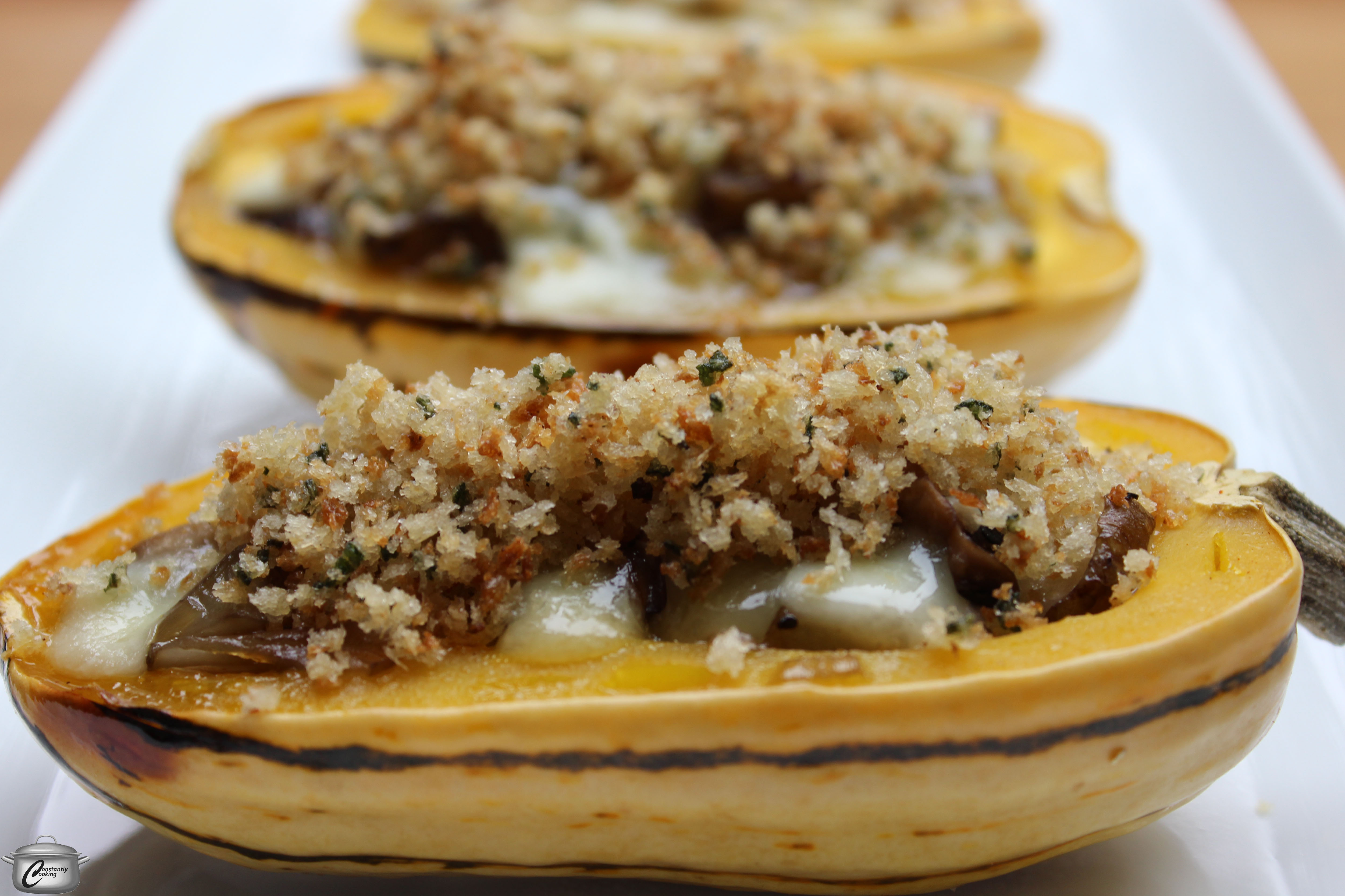 One of the things I love most about the Farmers’ Feast project (and about visiting farmers’ markets in general) is that it gets me working with new-to-me ingredients. This month, the sunchokes and Delicata squash included in my mystery basket from the Ottawa Farmers’ Market were the springboard for this dish. While I’d enjoyed sunchokes before, I’d never prepared them. These yummy tubers are also called Jerusalem artichokes (though they have nothing to do with Israel or artichokes) and are a member of the sunflower family. Before this week, I hadn’t even heard of Delicata squash, aptly named for its delicate skin, edible when cooked. You can prepare this dish with other varieties of squash or pumpkin, but I don’t recommend eating their rinds. As for the cheese, while Canreg Station Farm‘s Bee Balm cheese is absolutely delightful, Fontina would be an appropriate substitution. Aside from its stupendous flavour and attractive presentation, this dish is also a winner in my books because it can be prepared up to 2 days ahead then baked just before serving. It would make an impressive appetizer or lovely side dish.