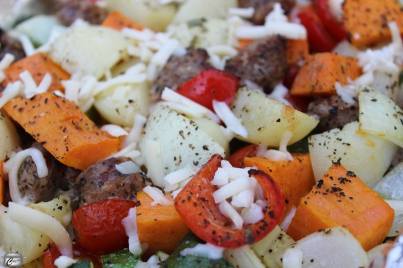 - Put potatoes, all other vegetables and sausage pieces into the lined roasting pan.