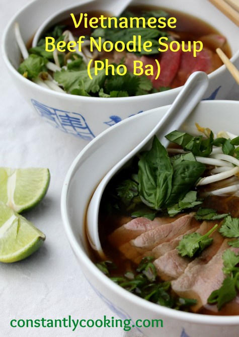 In my neighbourhood, there are several great spots to enjoy pho, the Vietnamese soup that has entrenched itself as a worldwide favourite. I feel inclined to add my voice to those who insist on proper pronunciation – say FUH (rhymes with DUH), not FOH, please and thank you. While it takes a little bit of time to prepare the fragrant, beefy broth, this recipe makes a big batch so you can freeze it in smaller portions and then you’re just minutes away from enjoying a warming bowl of soup whenever the mood strikes. While the method to make the broth may seem a little complicated, it really works and gives you that deep, rich taste that makes pho so satisfying. I’m no pho expert, but I think this version is super delicious.