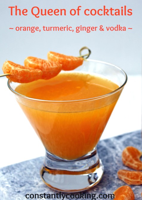 Combining freshly-squeezed orange juice with a turmeric and ginger-infused simple syrup makes for one heck of a delicious cocktail. I’ve chosen to make mine with vodka, a natural pairing with orange, but I’m sure it would be just as delicious with gin or even spiced rum. Why the Queen of Cocktails? That’s because turmeric has been dubbed the ‘spice of the year’ for 2016, and it’s also often referred to as the Queen of Spices. With its peppery, sharp taste and vibrant, stain-your-kitchen-towel yellow colour, this spice is used worldwide in cooking. We often see it in powdered form, but I prefer to use the whole root. Like other spices, working with the whole form provides greater flavour and aroma, plus, I suspect, greater nutritional benefits as well. So what makes turmeric such a powerhouse? It contains a vast range of antioxidant, antiviral, antibacterial, anti-inflammatory, antifungal and anti-carcinogenic properties. On top of that, it’s loaded with beneficial vitamins and minerals. We know orange juice is a great source of Vitamin C and given that turmeric and ginger are often used to treat a wide variety of ailments, it’s safe to say that this cocktail is genuinely good for you.