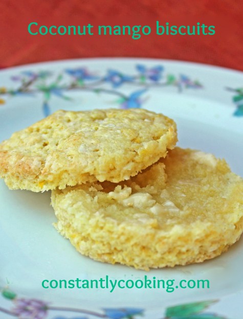 A childhood favourite, baking powder biscuits remain one of my go-to breakfast treats. I love to make a batch often in the morning as they’re quick and easy. I usually enjoy one or two then tuck the rest in the freezer as they reheat beautifully in the microwave. In addition to being a favourite start to the day, I find they’re a great sidekick for soup or salad to round out a light lunch or dinner. I’ve tried many different additions to my basic biscuit recipe and I think that coconut and mango is the best combination ever.