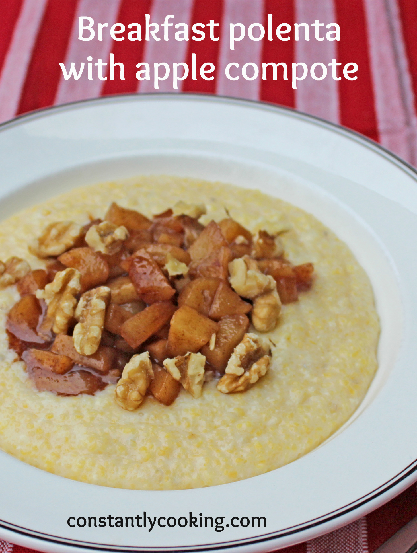- Ladle the polenta into bowls. Top with the diced apples, a splash of cream and a tablespoon or so of chopped walnuts, if desired. Serve immediately.