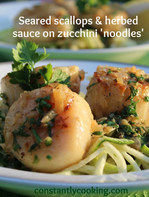 My garden is overflowing with tender young herbs which are finding their way into all kinds of dishes, like these scrumptious scallops, perched on a bed of raw zucchini noodles and bathed in a buttery herbed sauce. It’s probably the best thing I tasted all week (and that’s saying a lot, because I also ate this and drank this!) It’s one of those fantastic meals that comes together in mere moments and leaves you satisfied but not stuffed, particularly because the strands of raw zucchini are just so light and lovely.