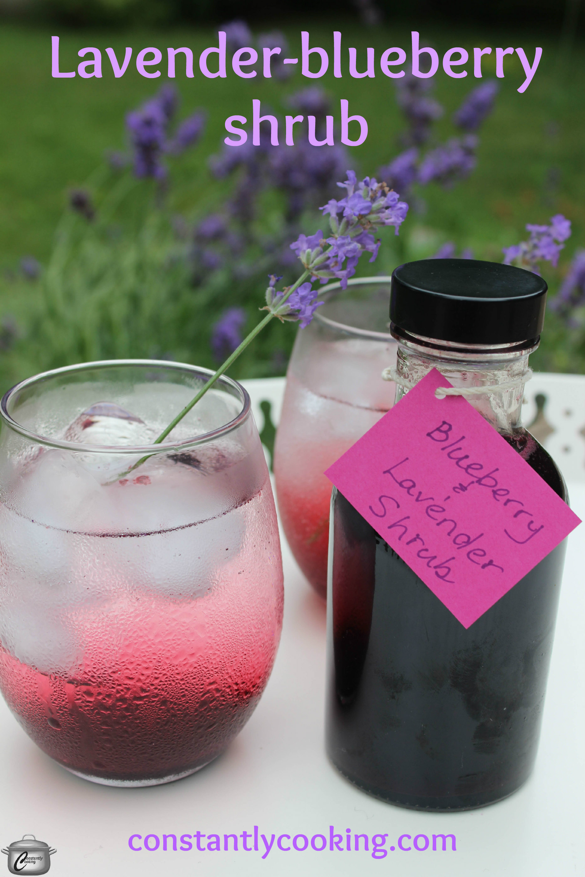 Shrubs are a big part of the current cocktail craze, and for good reason – they’re delicious! A shrub is a sweetened vinegar-based syrup, sometimes called drinking vinegar. Shrubs typically consist of vinegar infused with fruit juice, herbs and spices for use in cocktails or in salad dressings; they can also be used to flavour soups and sauces. Inspired by the lavender that’s blooming like mad in my garden, this shrub’s combination of lavender and blueberry is absolutely delicious and the lavender flavour is quite subtle thanks to the relative intensity of blueberries. You can use various types of vinegars as long as they are labeled as having at least 5 percent acidity. I prefer apple cider vinegar which tends to be milder than sharp-tasting white vinegar; wine and balsamic vinegars are also great to work with. Have fun experimenting with different combinations of flavours! Shrubs make fantastic host or hostess gifts.