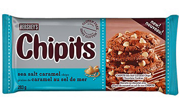 When I am grocery shopping, I try to restrain myself. You know, only buy what’s on my list, get everything in one pass through the store and don’t wrinkle the magazines I read in the checkout line. All restraint went out the window this week, however, when I spied a new product in the baking aisle. The pretty blue package of Hershey’s Sea Salt Caramel Chipits was positively yelling at me from the shelf; I may have squealed back in return when I realized what it was. Checking to make sure no one was watching, I grabbed 6 packages and tossed them into my cart. I bought a bunch because I am certain that once word gets out about this delicious new ingredient, there’s going to be a run on them and they’ll be impossible to find.