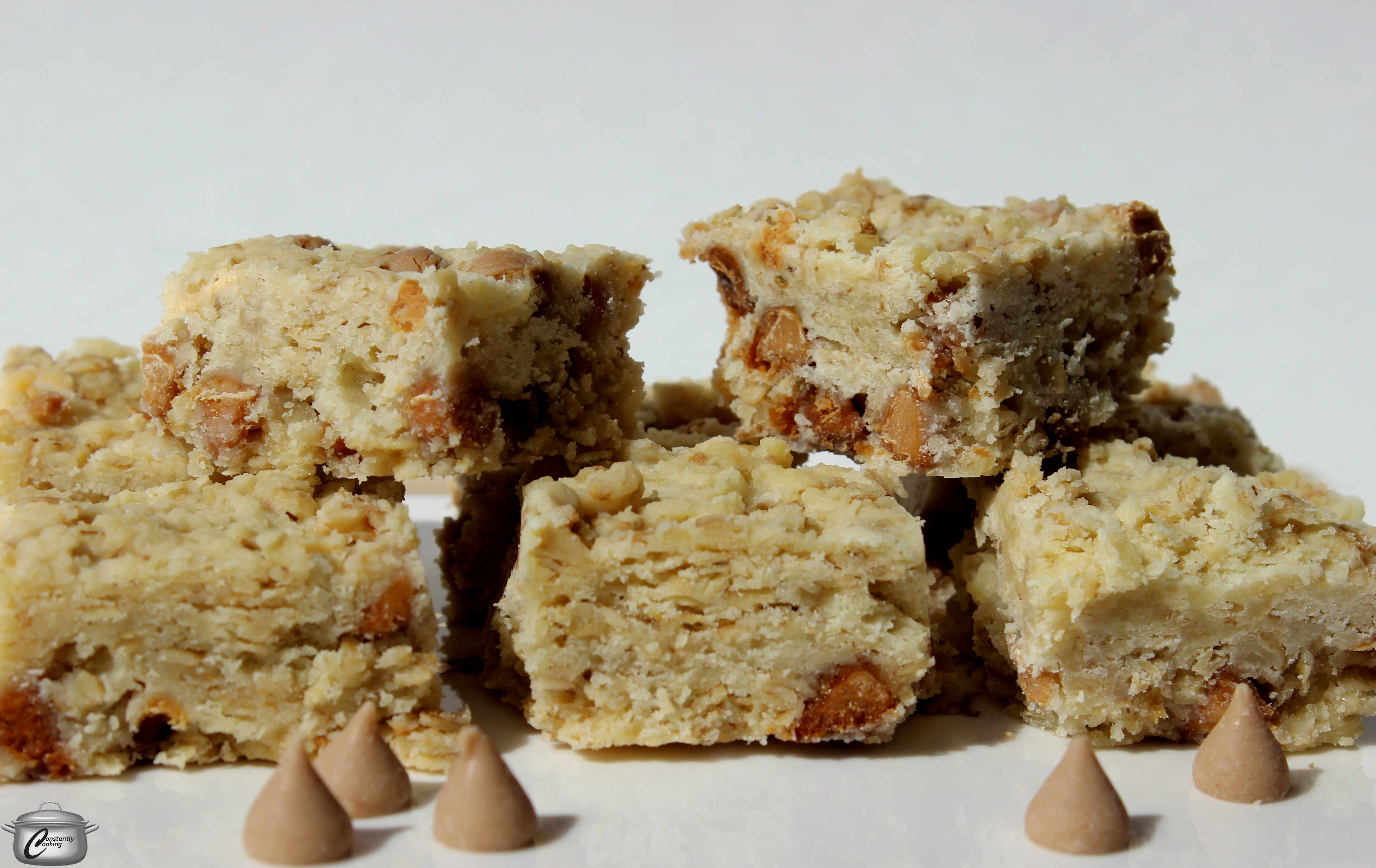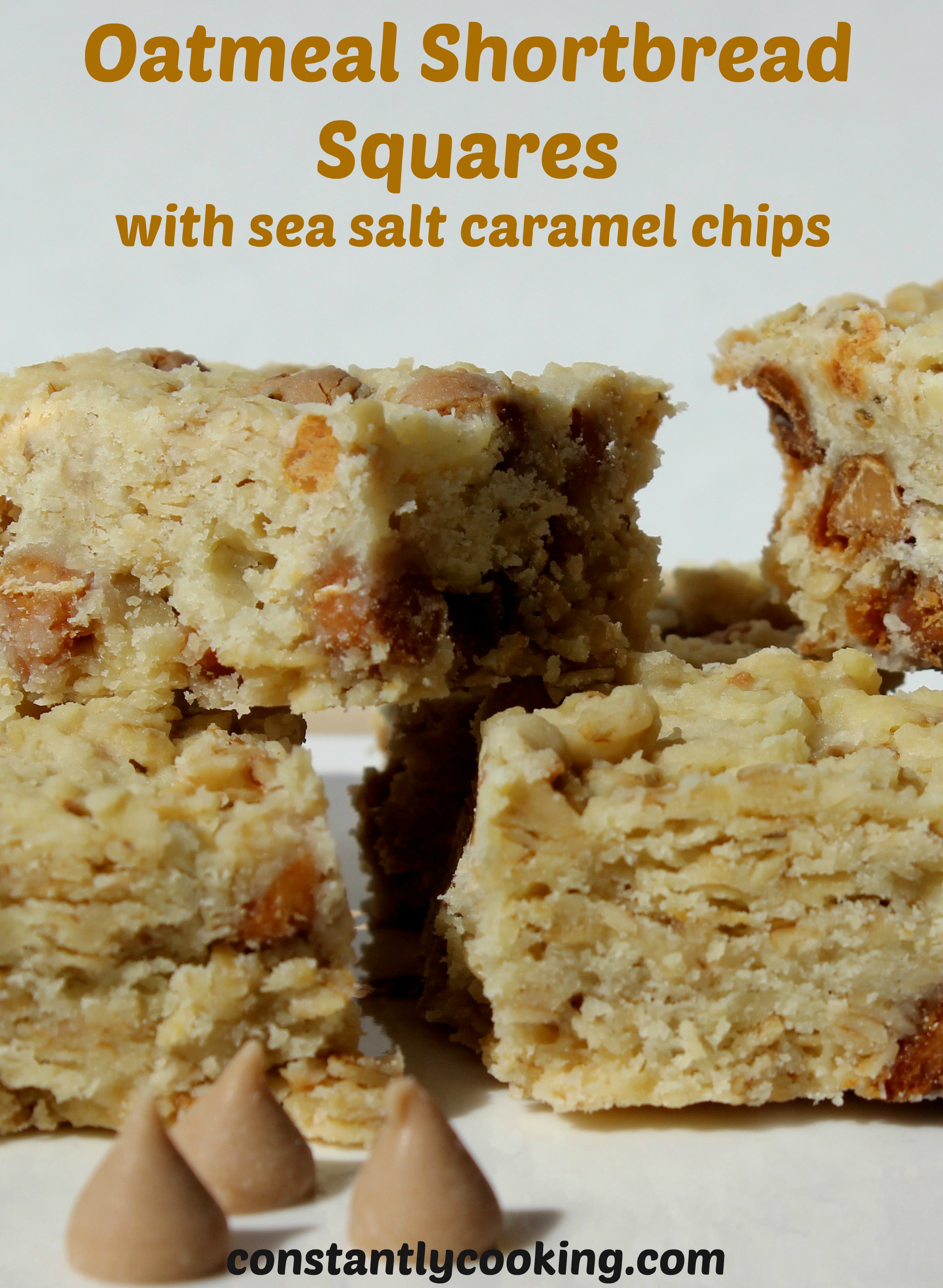 Like any good culinary scientist, I opened a package as soon as I got back to the car. For research, of course. The modicum of restraint that remained after the squealing episode in the store thankfully kicked in, otherwise I’d have been tempted to eat the whole bag as they are ridiculously tasty. I came up with this new recipe to honour the good people at Hershey’s who invented these sea salt caramel baking chips, to whom I extend my most sincere thanks. The squares are a snap to make, beautifully flaky and not overly sweet so you can really taste the salty caramel nuggets. Best of all, you can even feel virtuous about eating them since the oats make them a tiny bit healthy, right?