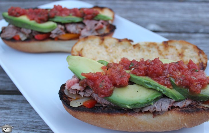 - To assemble sandwiches, put a layer of the cooked peppers and onions on the bottom bun, followed by the cheese, sliced steak, avocado and salsa. You can make them open faced or closed, according to your preference.