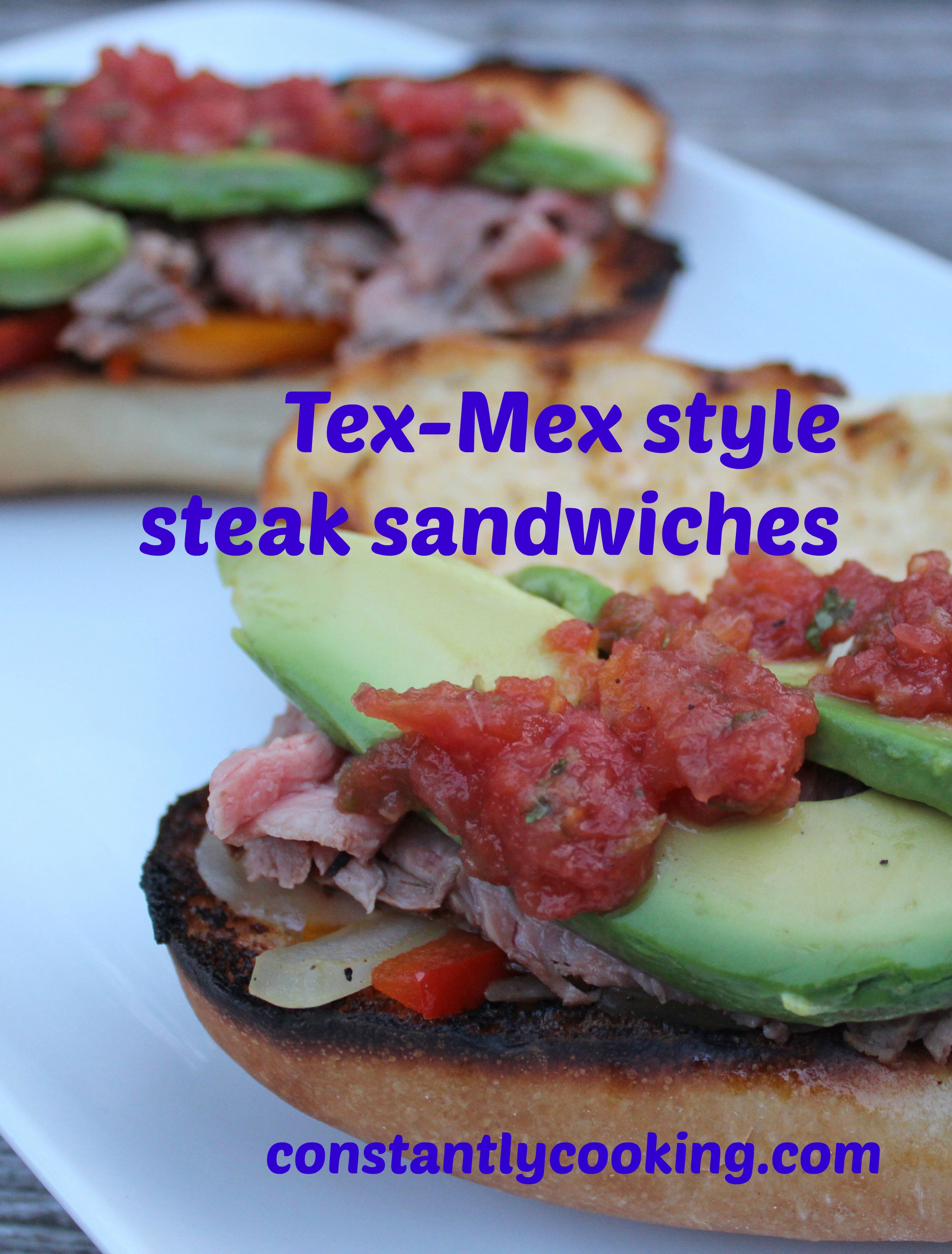 My menfolk had requested Philly cheesesteak sandwiches a week or so ago, but I just couldn’t oblige. I didn’t want anything to do with the state of Pennsylvania after the Pittsburgh Penguins bounced my team – the tenacious Ottawa Senators – out of the NHL playoffs. My solution to their bun-steak-cheese request was to come up with this Tex-Mex version, which was a huge hit. If you’re like me and love to plan ahead, you can put the meat in the marinade and toss it in the freezer; it will start to get infused with flavour as it freezes, and finish marinating when you take it out to thaw before grilling.