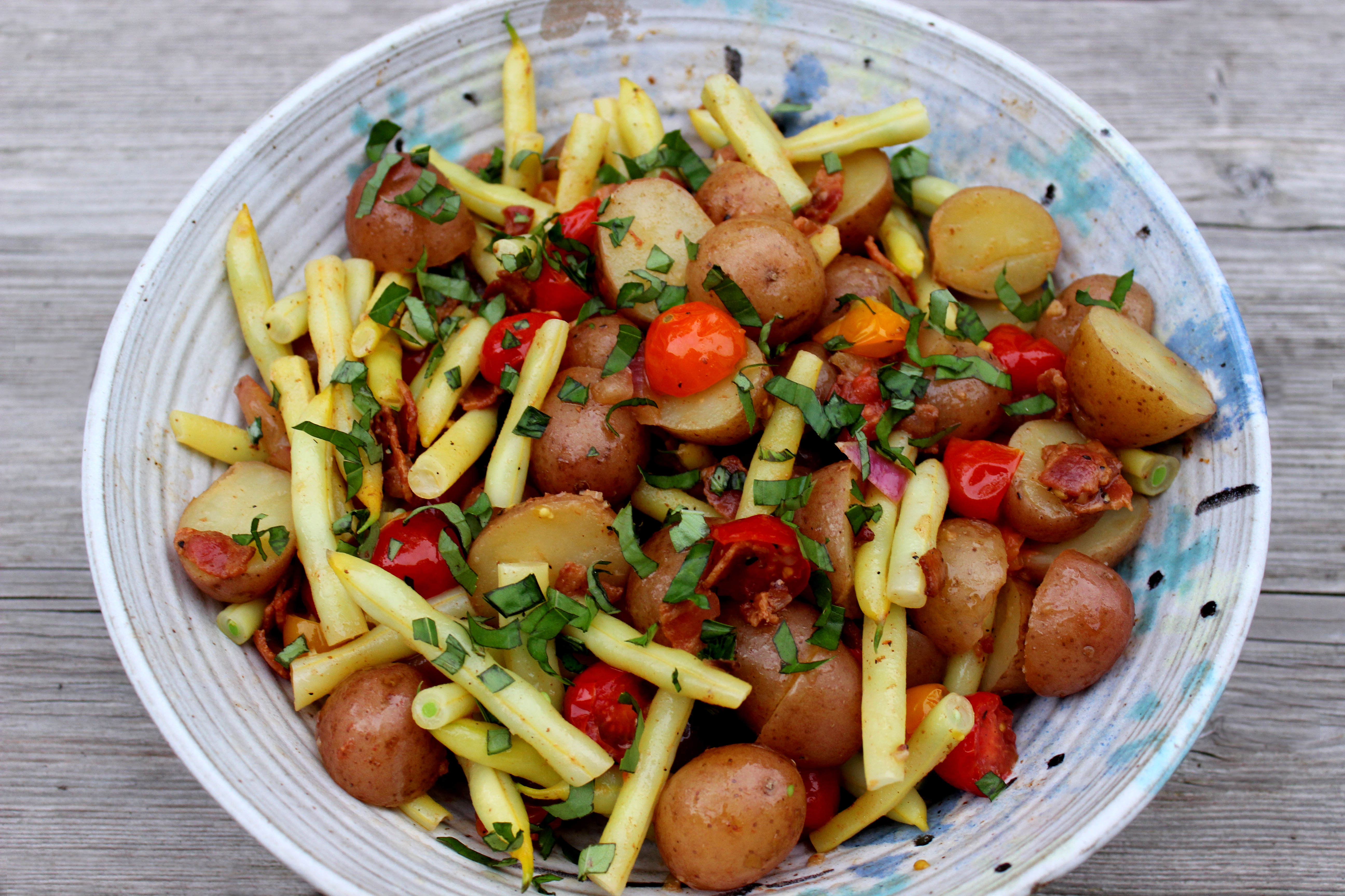 Yellow Bean, Red Potato and Cherry Tomato Salad with Bacon Dressing