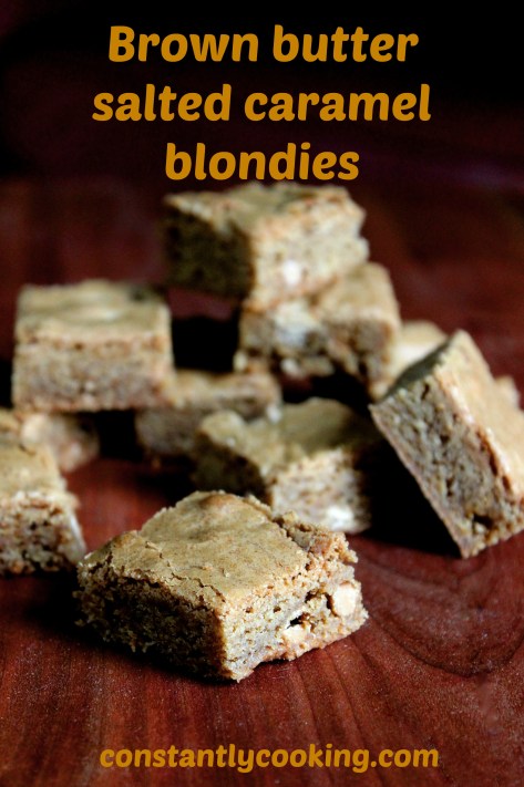 I love all things chocolate but have to say that few treats can beat a good blondie, in my opinion. Rich and satisfying, blondies share the chewy texture of brownies, but rely simply on butter and sugar for their distinctive flavour. As an experiment, I tried making a batch this week with brown butter and it was a huge hit with my eager taste testers. Of course, the addition of salted caramel baking chips may have swayed them a little too; they were the same testers who devoured a whole pan of oatmeal shortbread squares with salted caramel chips. This recipe is delicious with regular melted butter, but I highly recommend taking a few extra minutes to brown the butter. You’ll be glad you did.